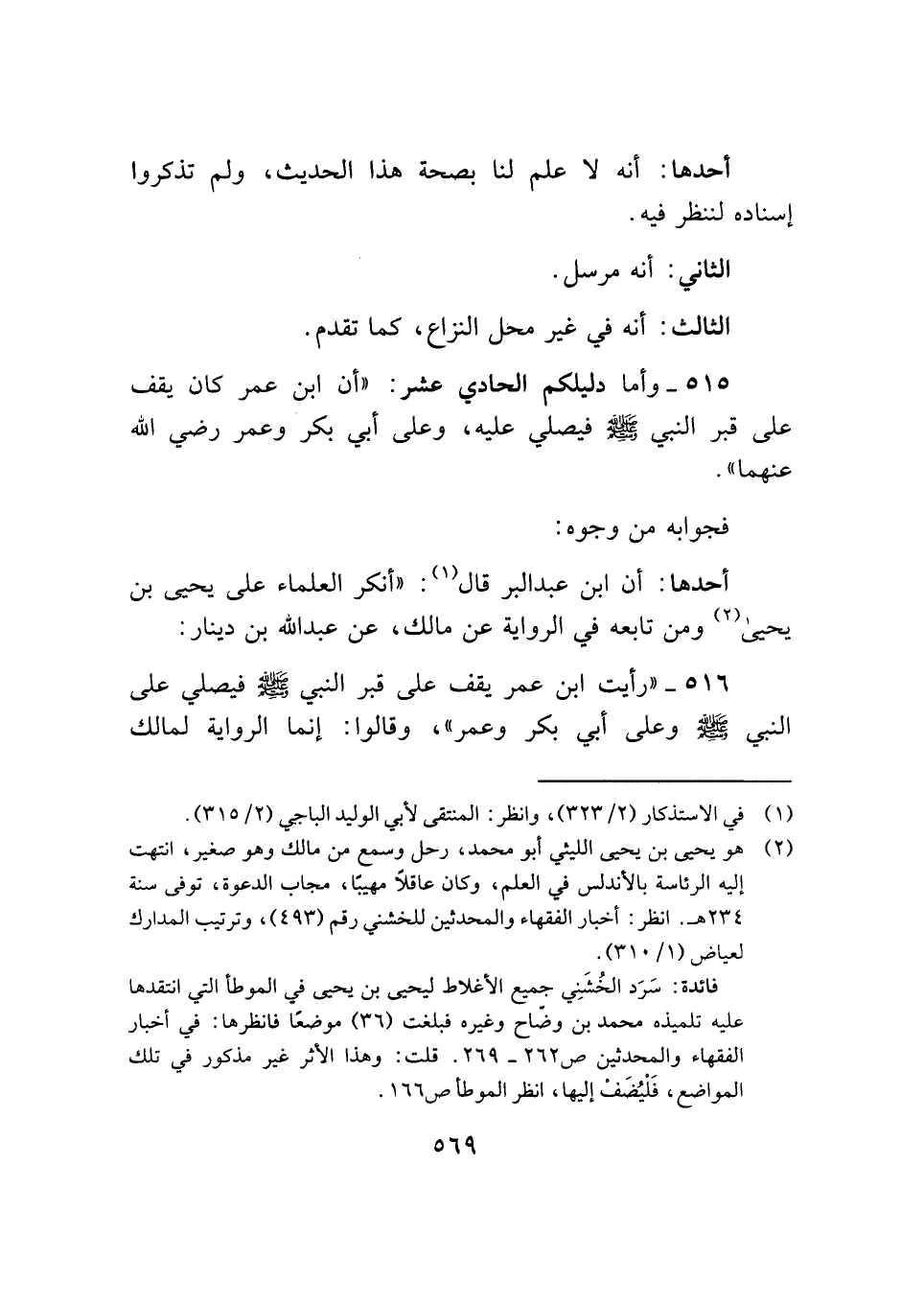 ٥١٦ - "رأيت ابن عمر يقف على قبر النبي - صلى الله عليه وسلم - فيصلي على النبي - صلى الله عليه وسلم - وعلى أبي بكر وعمر"، وقالوا: إنما الرواية لمالك