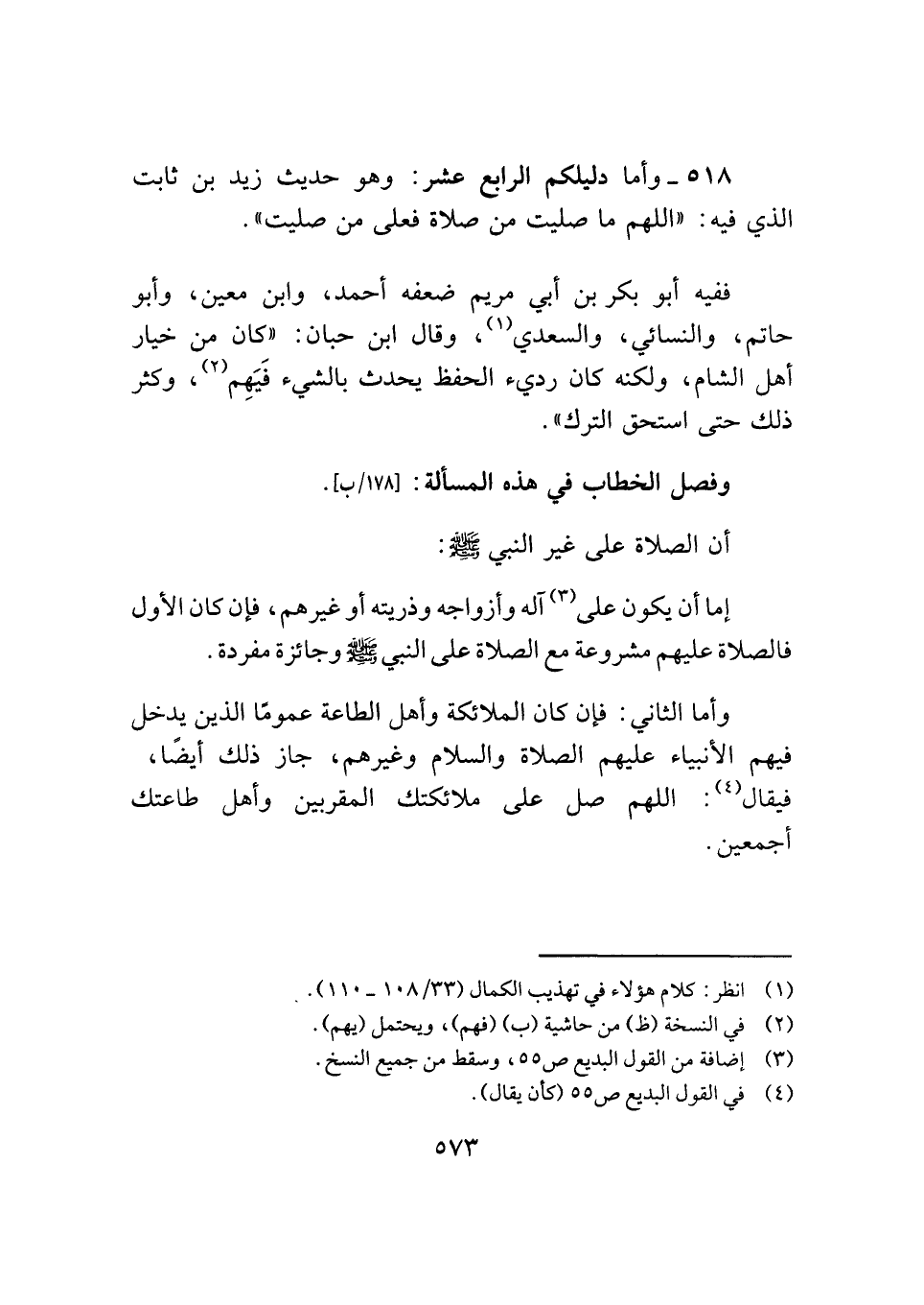 ٥١٨ - وأما دليلكم الرابع عشر: وهو حديث زيد بن ثابت الذي فيه: "اللهم ما صليت من صلاة فعلى من صليت".