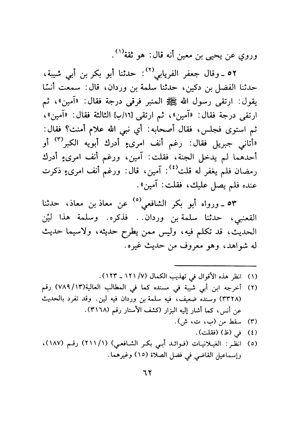 ٥٢ - وقال جعفر الفريابي (¬٢): حدثنا أبو بكر بن أبي شيبة، حدثنا الفضل بن دكين، حدثنا سلمة بن وردان، قال: سمعت أنسًا يقول: ارتقى رسول الله -صلى الله عليه وسلم- المنبر فرقى درجة فقال: "آمين"، ثم ارتقى درجة فقال: "آمين"، ثم ارتقى الثالثة فقال: "آمين"، ثم استوى فجلس، فقال أصحابه: أي نبي الله علام أمنت؟ فقال: "أتاني جبريل فقال: رغم أنف امرئٍ أدرك أبويه الكبر (¬٣) أو أحدهما لم يدخل الجنة، فقلت: آمين، ورغم أنف امرئٍ أدرك رمضان فلم يغفر له قلت (¬٤): آمين، قال: ورغم أنف امرئٍ ذكرت عنده فلم يصل عليك، فقلت: آمين".