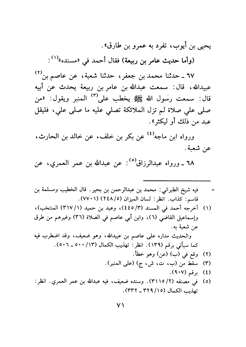 ٦٧ - حدثنا محمد بن جعفر، حدثنا شعبة، عن عاصم بن (¬٢) عبيد الله، قال: سمعت عبد الله بن عامر بن ربيعة يحدث عن أبيه قال: سمعت رسول الله -صلى الله عليه وسلم- يخطب على (¬٣) المنبر ويقول: "من صلى علي صلاة لم تزل الملائكة تصلي عليه ما صلى علي، فليقل عبد من ذلك أو ليكثر".