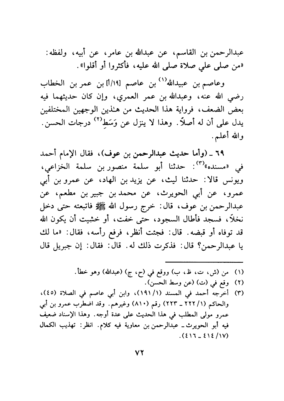 (¬٣) أخرجه أحمد في المسند (١/ ١٩١)، وابن أبي عاصم في الصلاة (٤٥)، والحاكم (١/ ٢٢٢ - ٢٢٣) رقم (٨١٠) وغيرهم. وقد اضطرب عمرو بن أبي عمرو مولى المطلب في هذا الحديث على عدة أوجه. وهذا الإسناد ضعيف فيه أبو الحويرث - عبد الرحمن بن معاوية فيه كلام. انظر: تهذيب الكمال (١٧/ ٤١٤ - ٤١٦).