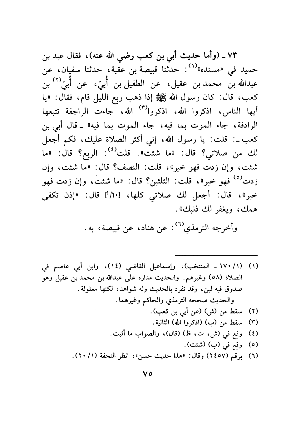 ٧٣ - (وأما حديث أبي بن كعب رضي الله عنه)، فقال عبد بن حميد في "مسنده" (¬١): حدثنا قبيصة بن عقبة، حدثنا سفيان، عن عبد الله بن محمد بن عقيل، عن الطفيل بن أُبيّ، عن أُبيّ (¬٢) بن كعب، قال: كان رسول الله -صلى الله عليه وسلم- إذا ذهب ربع الليل قام، فقال. "يا أيها الناس، اذكروا الله، اذكروا (¬٣) الله، جاءت الراجفة تتبعها الرادفة، جاء الموت بما فيه، جاء الموت بما فيه" -قال أبي بن كعب-: قلت: يا رسول الله -صلى الله عليه وسلم- ، إني أكثر الصلاة عليك، فكم أجعل لك من صلاتي؟ قال: "ما شئت". قلت (¬٤): الربع؟ قال: "ما شئت، وإن زدت فهو خير"، قلت: النصف؟ قال: "ما شئت، وإن زدت (¬٥) فهو خير"، قلت: الثلثين؟ قال: "ما شئت، وإن زدت فهو خير"، قال: أجعل لك صلاتي كلها، قال: "إذن تكفى همك، ويغفر لك ذنبك".