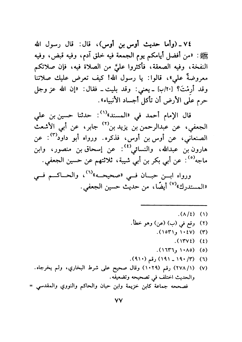 ٧٤ - (وأما حديث أوس بن أوس)، قال: قال رسول الله -صلى الله عليه وسلم-: "من أفضل أيامكم يوم الجمعة فيه خلق آدم، وفيه قبض، وفيه النفخة، وفيه الصعقة، فأكثروا عليَّ من الصلاة فيه، فإن صلاتكم معروضةٌ علي"، قالوا: يا رسول الله! كيف تعرض عليك صلاتنا وقد أرِمْتَ؟ - يعني: وقد بليت- فقال: "إن الله عز وجل حرم على الأرض أن تأكل أجساد الأنبياء".