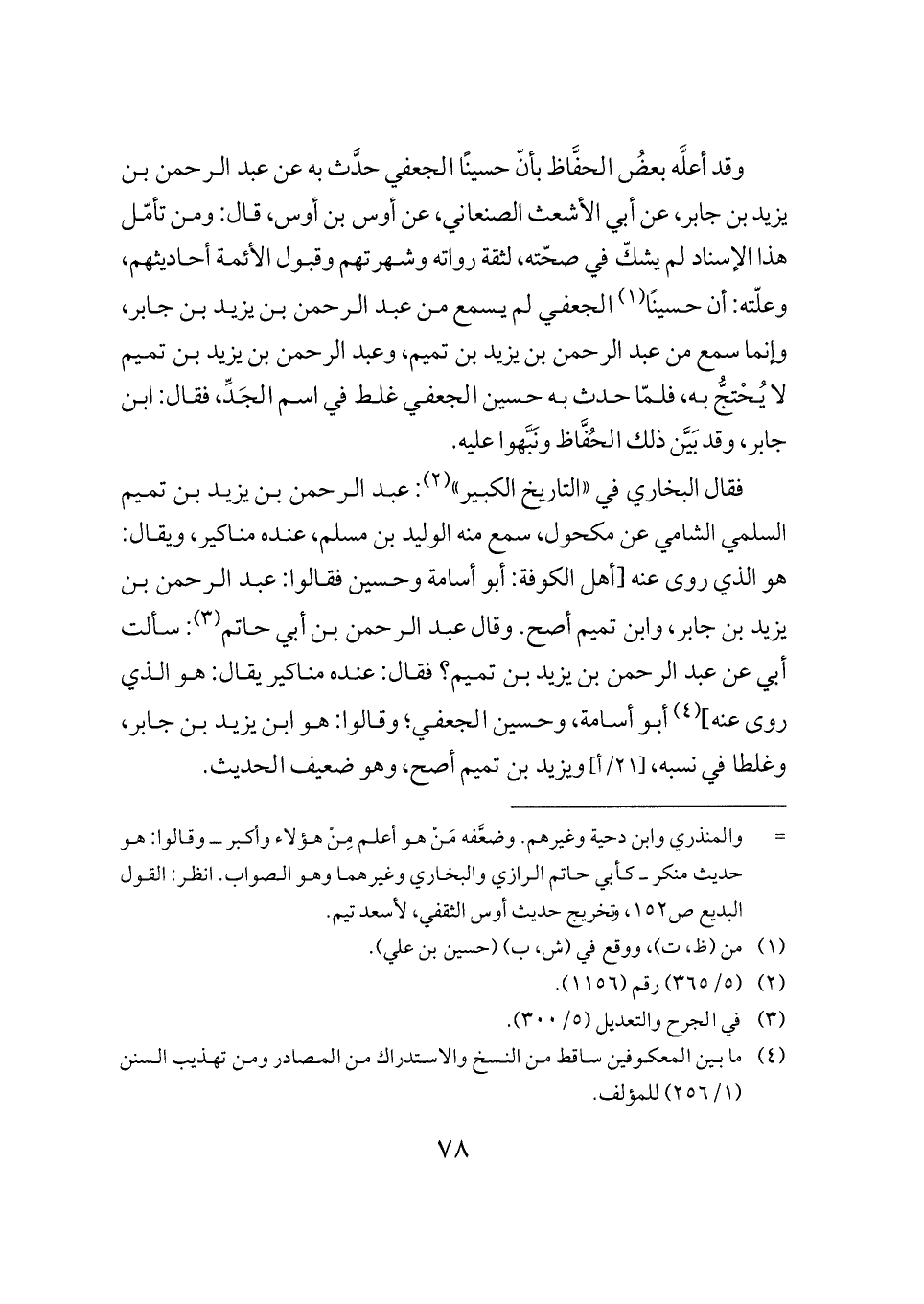 وقد أعلَّه بعض الحفَّاظ بأنّ حسينًا الجعفي حدث به عن عبد الرحمن بن يزيد بن جابر، عن أبي الأشعث الصنعاني، عن أوس بن أوس، قال: ومن تأمّل هذا الإسناد لم يشكّ في صحّته، لثقة رواته وشهرتهم وقبول الأئمة أحاديثهم، وعلّته: أن حسينًا (¬١) الجعفي لم يسمع من عبد الرحمن بن يزيد بن جابر، وإنما سمع من عبد الرحمن بن يزيد بن تميم، وعبد الرحمن بن يزيد بن تميم لا يُحْتجُّ به، فلمّا حدث به حسين الجعفي غلط في اسم الجَدِّ، فقال: ابن جابر، وقد بَيَّن ذلك الحُفَّاظ ونَبَّهوا عليه.