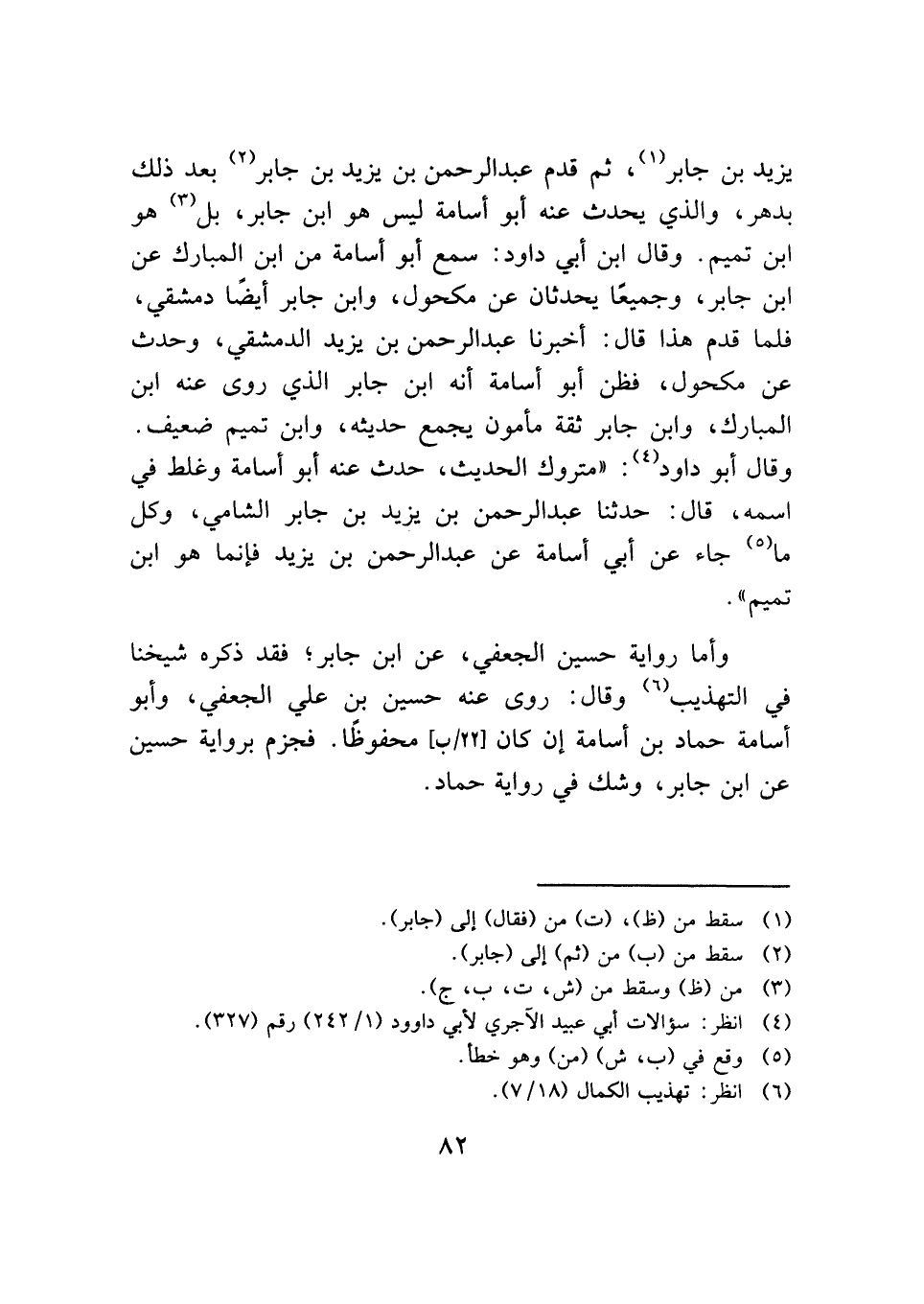 يزيد بن جابر (¬١)، ثم قدم عبد الرحمن بن يزيد بن جابر (¬٢) بعد ذلك بدهر، والذي يحدث عنه أبو أسامة ليس هو ابن جابر، بل (¬٣) هو ابن تميم. وقال ابن أبي داود: سمع أبو أسامة من ابن المبارك عن ابن جابر، وجميعًا يحدثان عن مكحول، وابن جابر أيضًا دمشقي، فلما قدم هذا قال: أخبرنا عبد الرحمن بن يزيد الدمشقي، وحدث عن مكحول، فظن أبو أسامة أنه ابن جابر الذي روى عنه ابن المبارك، وابن جابر ثقة مأمون يجمع حديثه، وابن تميم ضعيف. وقال أبو داود (¬٤): "متروك الحديث، حدث عنه أبو أسامة وغلط في اسمه، قال: حدثنا عبد الرحمن بن يزيد بن جابر الشامي، وكل ما (¬٥) جاء عن أبي أسامة عن عبد الرحمن بن يزيد فإنما هو ابن تميم".