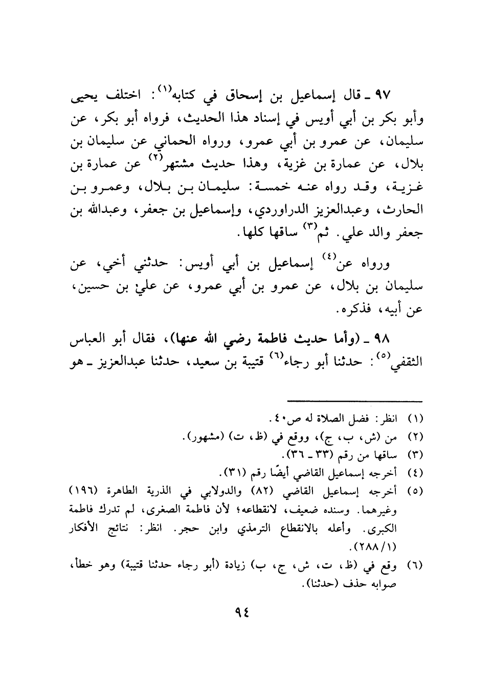 ٩٨ - (وأما حديث فاطمة رضي الله عنها)، فقال أبو العباس الثقفي (¬٥): حدثنا أبو رجاء (¬٦) قتيبة بن سعيد، حدثنا عبد العزيز -هو