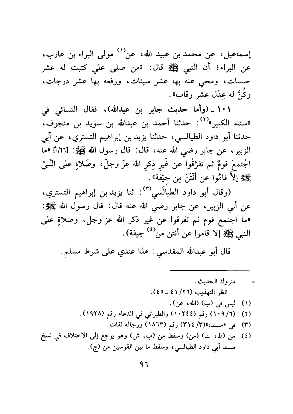 ١٠١ - (وأما حديث جابر بن عبد الله)، فقال النسائي في "سننه الكبير" (¬٢): حدثنا أحمد بن عبد الله بن سويد بن منجوف، حدثنا أبو داود الطيالسي، حدثنا يزيد بن إبراهيم التستري، عن أبي الزبير، عن جابر رضي الله عنه، قال: قال رسول الله - صلى الله عليه وسلم -: "ما اجْتمعَ قومٌ ثم تفرَّقُوا عن غَيرِ ذِكرِ الله عزّ وجلّ، وصَلاةٍ على النَّبيِّ - صلى الله عليه وسلم - إلَّا قامُوا عن أنْتَنَ مِن جيْفة".