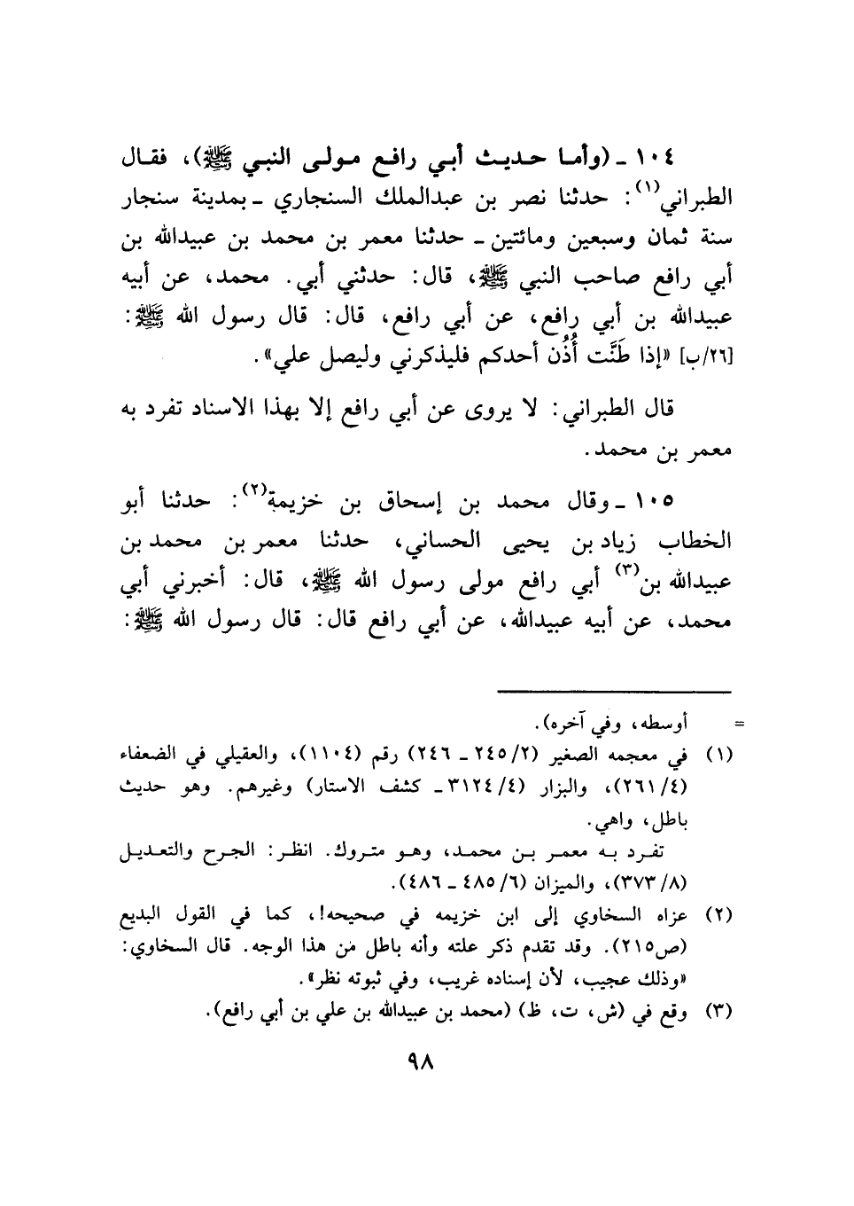 ١٠٤ - (وأما حديث أبي رافع مولي النبي - صلي الله عليه وسلم -)، فقال الطبراني (¬١): حدثنا نصر بن عبد الملك السنجاري -بمدينة سنجار سنة ثمان وسبعين ومائتين- حدثنا معمر بن محمد بن عبيد الله بن أبي رافع صاحب النبي - صلى الله عليه وسلم -، قال: حدثني أبي. محمد، عن أبيه عبيد الله بن أبي رافع، عن أبي رافع، قال: قال رسول الله - صلى الله عليه وسلم -: "إذا طَنَّت أُذُن أحدكم فليذكرني وليصل علي".