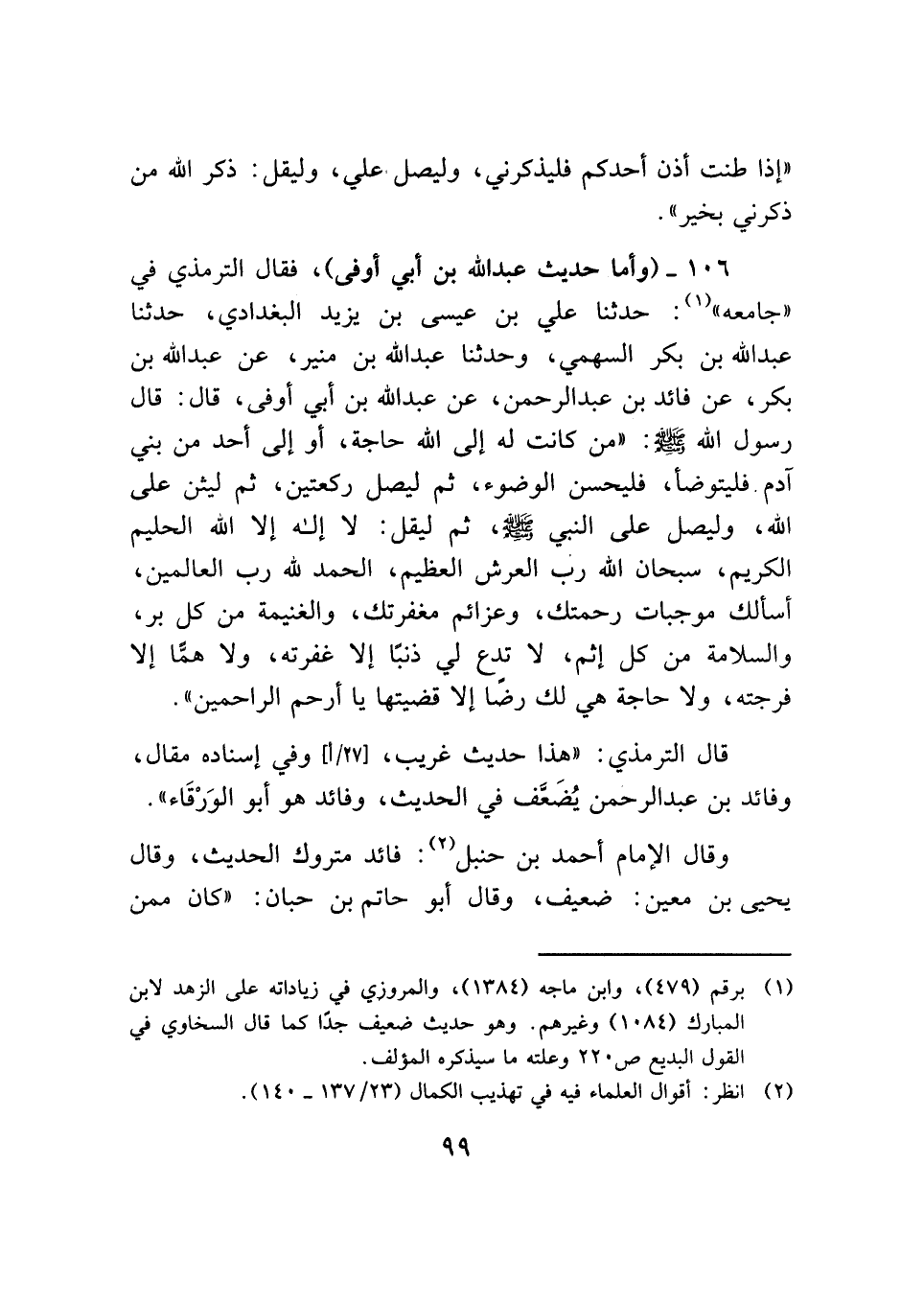 ١٠٦ - (وأما حديث عبد الله بن أبي أوفي)، فقال الترمذي في "جامعه" (¬١): حدثنا علي بن عيسي بن يزيد البغدادي، حدثنا عبد الله بن بكر السهمي، وحدثنا عبد الله بن منير، عن عبد الله بن بكر، عن فائد بن عبد الرحمن، عن عبد الله بن أبي أوفي، قال: قال رسول الله - صلى الله عليه وسلم -: "من كانت له إلي الله حاجة، أو إلي أحد من بني آدم فليتوضأ، فليحسن الوضوء، ثم ليصل ركعتين، ثم ليثن علي الله، وليصل علي النبي - صلى الله عليه وسلم -، ثم ليقل: لا إله إلا الله الحليم الكريم، سبحان الله رب العرش العظيم، الحمد لله رب العالمين، أسألك موجبات رحمتك، وعزائم مغفرتك، والغنيمة من كل بر، والسلامة من كل إثم، لا تدع لي ذنبًا إلا غفرته، ولا همًّا إلا فرجته، ولا حاجة هي لك رضًا إلا قضيتها يا أرحم الراحمين".