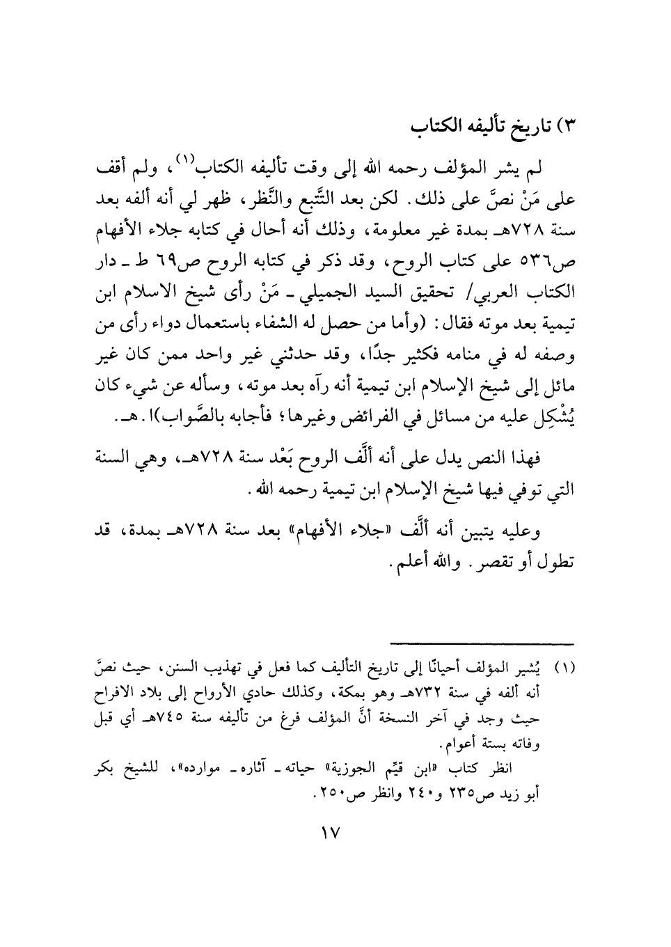 وعليه يتبين أنه ألَّف "جلاء الأفهام" بعد سنة ٧٢٨ هـ بمدة، قد تطول أو تقصر. والله أعلم.