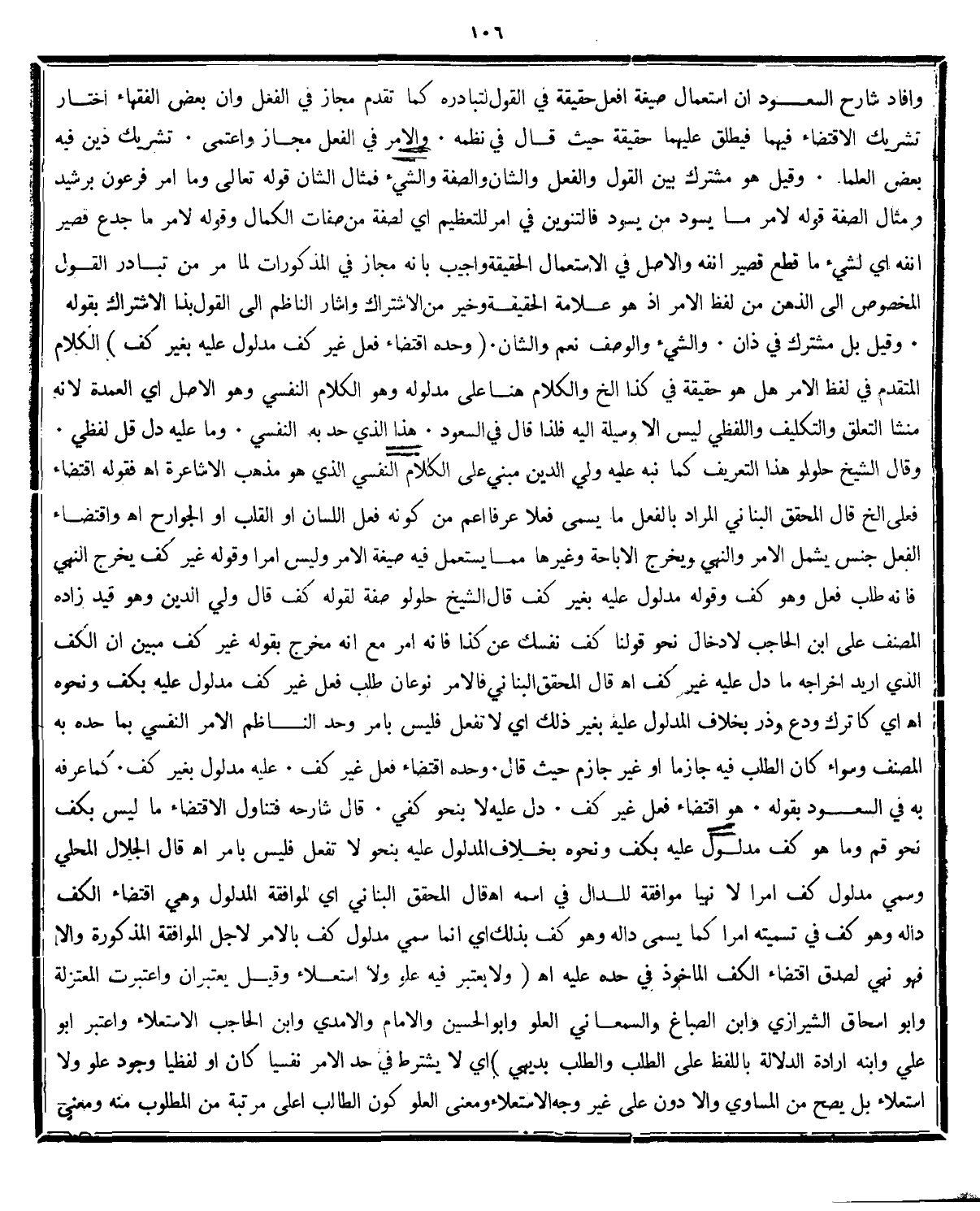 قال شارحه فتناول الاقتضاء ما ليس بكف نحو قم وما هو كف مدلول عليه بكف ونحوه بخلاف المدلول عليه بنحو لاتفعل فليس بامر اه. قال الجلال المحلى: وَسُمِّيَ مَدْلُولُ كَفٍّ أَمْرًا لَا نَهْيًا مُوَافَقَةً لِلدَّالِّ فِي اسْمِهِ اه. قال المحقق البنانى أي الموافقة المدلول وهى اقتضاء الكف دالة وهو كف فى تسمية امراكما يسمى داله وهو كف بذلك أي انما سمى مدلول كف بالامر لاجل الموافقة المذكورة والا فهو نهى لصدق الكف الماخوذ فى حده عليه اه. (وَلَا يُعْتَبَرُ فِيهِ عُلُوٌّ وَلَا اسْتِعْلَاءٌ وَقِيلَ يُعْتَبَرَانِ وَاعْتَبَرَتْ الْمُعْتَزِلَةُ وَأَبُو إسْحَاقَ الشِّيرَازِيُّ وَابْنُ الصَّبَّاغِ وَالسَّمْعَانِيُّ الْعُلُوَّ وَأَبُو الْحُسَيْنِ وَالْإِمَامُ وَالْآمِدِيُّ وَابْنُ الْحَاجِبِ الِاسْتِعْلَاءَ وَاعْتَبَرَ أَبُو عَلِيٍّ وَابْنُهُ إرَادَةَ الدَّلَالَةِ بِاللَّفْظِ عَلَى الطَّلَب وَالطَّلَبُ بَدِيهِيٌّ) أي لايشترط فى حد الامر نفسيا كان او لفظيا وجود علو ولا استعلاء بل يصح من المساوي والا دون على غير وجه الاستعلاء ومعنى العلو كون الطالب اعلى مرتبة من المطلوب منه ومعنى