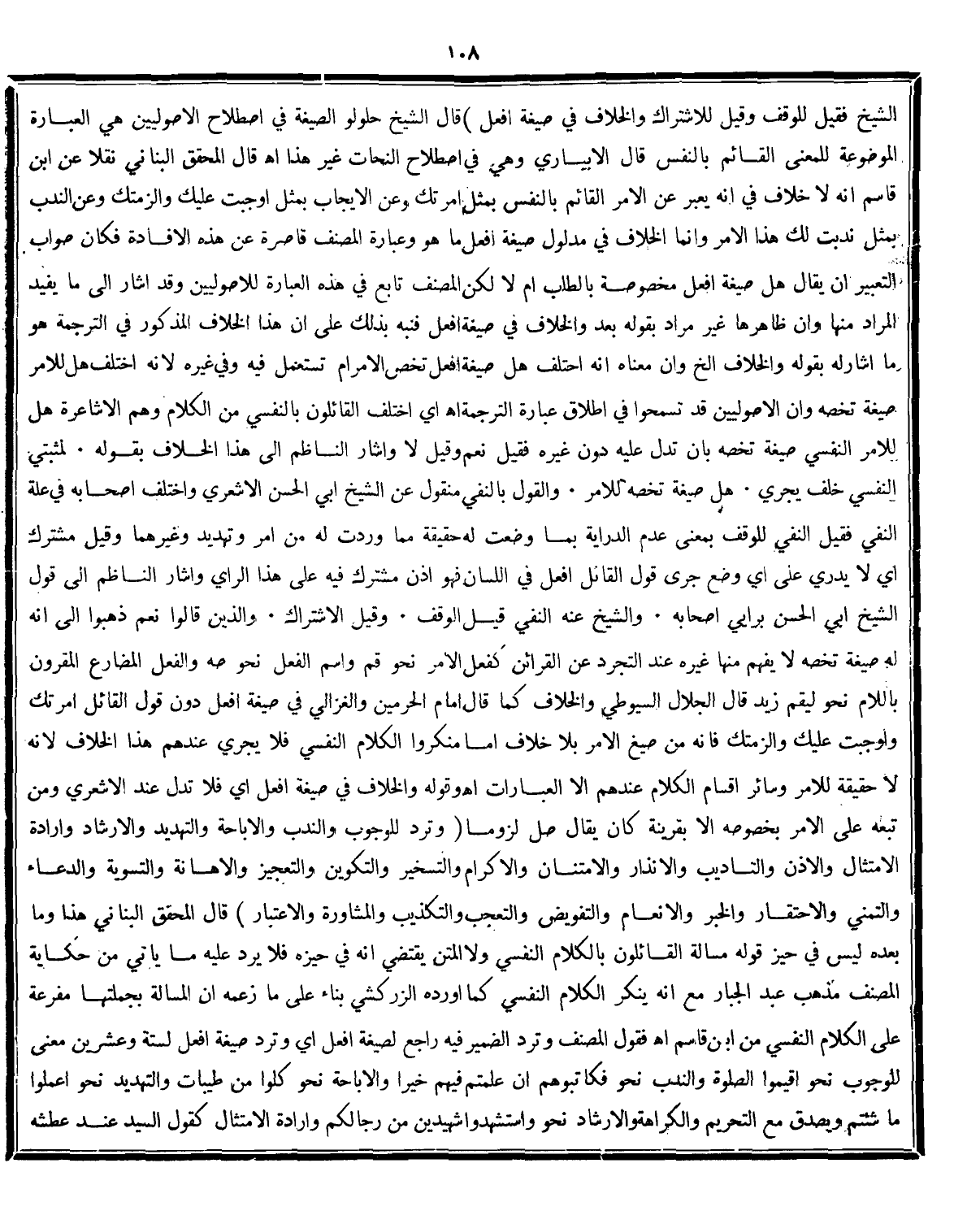 الشَّيْخِ فَقِيلَ لِلْوَقْفِ وَقِيلَ وَالْخِلَافُ فِي صِيغَةِ اِفْعَلْ) قال الشيخ حلولو الصيغة فى اصطلاح الاصوليين هى العبارة الموضوعة للمعنى القائم بالنفس قال الابياري وهى فى اصطلاح النحاة غير هذا اه. قال المحقق البنانى نقلا عن ابن قاسم انه لاخلاف فى انه يعبر عن الامر القائم بالنفس بمثل امرتك وعن الايجاب بمثل اوجبت عليك والزمتك وعن الندب بمثل ندبت لك هذالامر وانما الخلاف فى مدلول صيغة افعل ما هوو عبارة المصنف قاصرة عن هذه الافادة فكان صواب التعبير ان يقال هل صيغة افعل مخصوصة بالطلب ام لا لكن المصنف تابع فى هذه العبارة للاصوليين وقد اشار الى ما يفيد المراد منها وان ظاهرها غير مراد بقوله والخلاف فى صيغة افعل فنبه بذلك على ان هذا الخلاف المذكور فى الترجمة هو ما اشار له بقوله والخلاف الخ وان معناه انه اختلف هل صيغة افعل تخص الامر تستعمل فيه وفى غيره لانه اختلف هل للامر صيغة تخصه ان الاصوليين قد تسمحوا فى اطلاق عبارة الترجمة اه أي اختلف القائلون بالنفسى من الكلام وهم الاشاعرة هل للامر النفسى صيغة تخصه بان تدل عليه دون غيره فقيل نعم وقيل لا واشارالناظم الى هذا الخلاف بقوله: