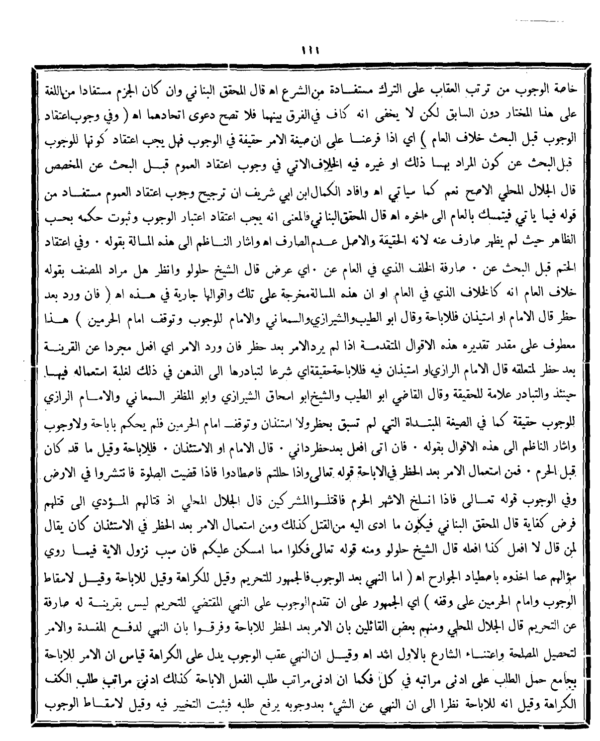 وفِي اعْتِقَادِ الْحَتْمِ قَبْلَ البَحْثِ عَنْ ... صَارِفِهِ الْخُلْفُ الَّذِي فِي العَامِ عَنّ أي عرض قال الشيخ حلولو وانظر هل مراد المصنف بقوله خلاف العام انه كالخلاف الذي فى العام اوان هذه المسألة مخرجة على تلك واقوالها جارية فى هذه اه. (فَإِنْ وَرَدَ الْأَمْر بَعْدَ حَظْرٍ قَالَ الْإِمَامُ أَوْ الِاسْتِئْذَانُ فَلِلْإِبَاحَةِ وَقَالَ أَبُو الطَّيِّبِ الشِّيرَازِيُّ وَالسَّمْعَانِيُّ وَالْإِمَامُ لِلْوُجُوبِ وَتَوَقَّفَ إمَامُ الْحَرَمَيْنِ) هذا معطوف على مقدر تقديرهذه الاقوال المتقدمة اذالم يرد الامر بعد حظر فان ورد الامر أي افعل مجردا عن القرينة بعد حظر لمتعلقه قال الامام الرازي او استيذان فيه فللاباحة حقيقة أي شرعا لتبادرها الى الذهن فى ذلك للغلبة استعماله فيها حينئذ والتبادر علامة للحقيقة وقال القاضى ابو الطيب والشيخ ابو اسحاق الشيرازي وابومظفر السمعانى والامام الرازي للوجوب حقيقة كما فى الصيغة المبتداة التى لم تسبق بحظر ولا استئذان وتوقف الامام الحرمين فلم يحكم باباحة ولا وجوب واشارالناظم الى هذه الاقوال بقوله: