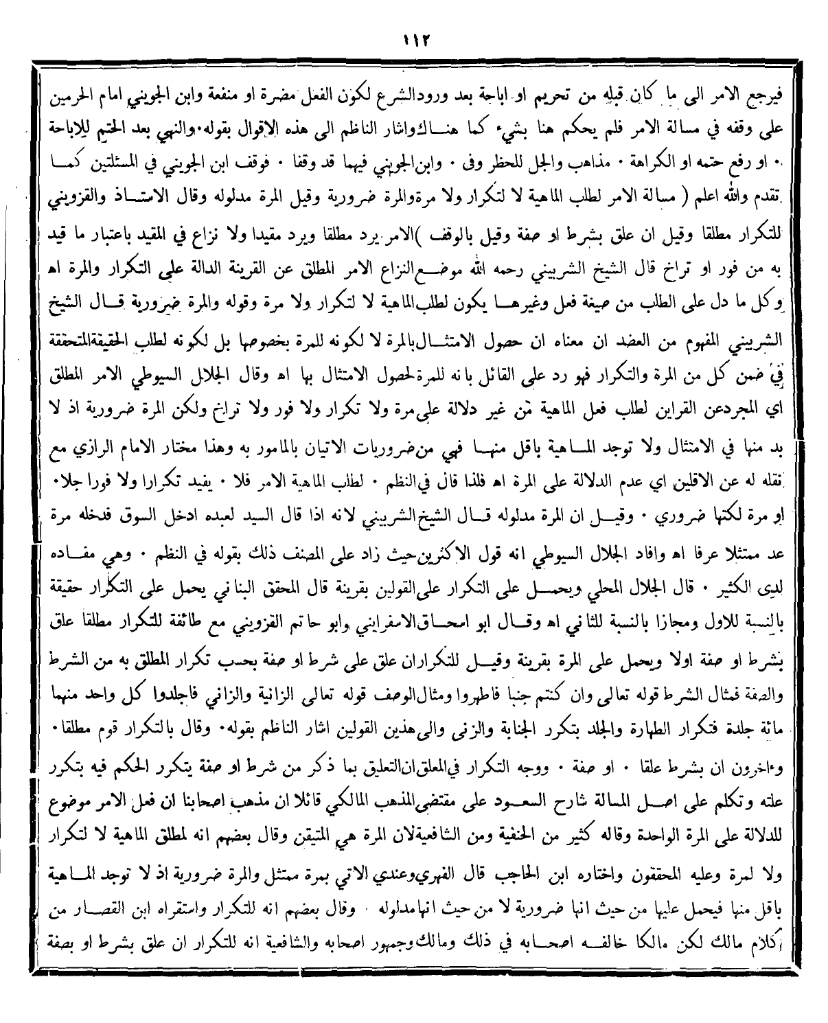 (مَسْأَلَةُ الْأَمْرِلِطَلَبِ الْمَاهِيَّةِ لَا التَّكْرَارِ وَلَا مَرَّةَ وَالْمَرَّةُ ضَرُورِيَّةٌ وَقِيلَ مَدْلُولَة وَقَالَ الْأُسْتَاذ والْقَزْوِينِي لِلتَّكْرَارِ مُطْلَقًا وَقِيل إنْ عَلِقَ بِشَرْطٍ أَوْ صِفَةٍ) الامر يرد مطلقا ويرد مقيدا ولا نزاع في المقيد باعتبار ما قيد به من فوز اوتراخ قال الشيخ الشربينى رحمه الله موضع النزاع الامر المطلق عن القرينة الدالة على التكرار والمرة اه.