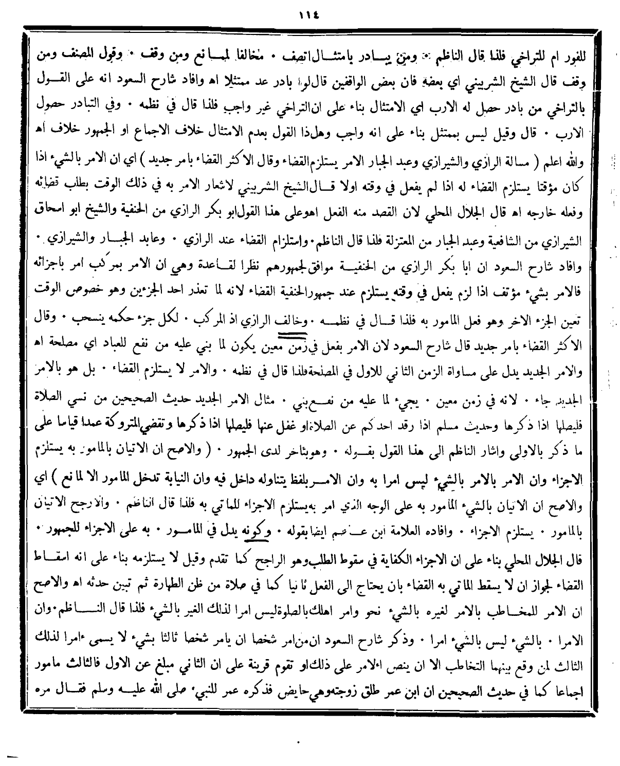 وافاد شارح السعود ان ابا بكر الرازي من الحنفية موافق لجمهورهم نظرا لقاعدة وهى ان الامر بمركب امر باجزائه فالامر بشيء مؤتف اذا لزم يفعل فى وقته يسْتَلْزم عند جمهور الحنفية القَضَاءَ لانه لما تعذر احد الجزئين وهو خصوص الوقت تعين الجزء الاخر وهو فعل المامور به فلذا قال فى نظمه: