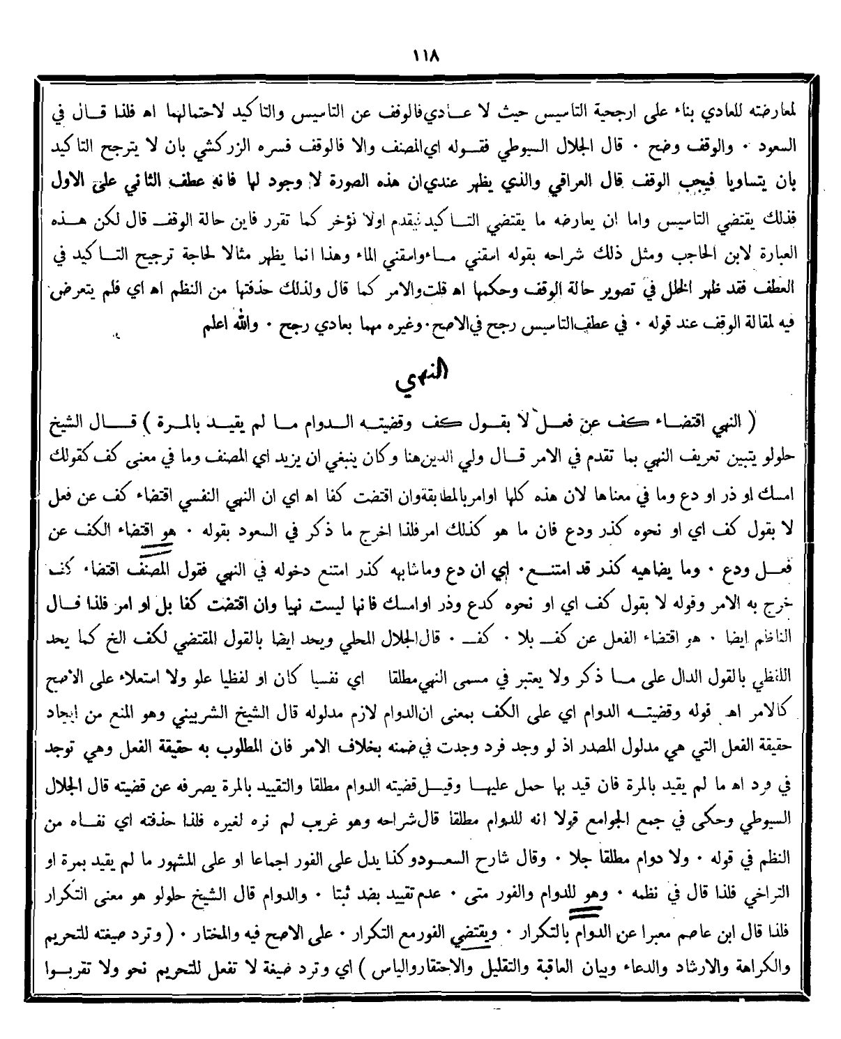 وَيُحَدُّ أَيْضًا بِالْقَوْلِ الْمُقْتَضِي لِكَفّ إلَخْ كَمَا يُحَدُّ اللَّفْظِيُّ بِالْقَوْلِ الدَّالِّ عَلَى مَا ذُكِرَ وَلَا يُعْتَبَرُ فِي مُسَمَّى النَّهْيِ مُطْلَقًا عُلُوٌّ وَلَا اسْتِعْلَاءٌ عَلَى الْأَصَحِّ كَالْأَمْر اه. قوله وَقَضِيَّةُ الدَّوَامِ اي عَلَى الْكَفِّ بمعنى ان الدوام لازم مدلوله قال الشيخ الشربينى وهو المنع من ايجاد حقيقة الفعل التى هى مدلول المصدر اذ لو وجد فرد وجدت فى ضمنه بخلاف الامر فان المطلوب به حقيقة الفعل وهى توجد فى فرد اه. ما لم مَا لَمْ يُقَيَّدْ بِالْمَرَّةِ فَإِنْ قُيِّدَ بِهَا حمل عليها وقيل قضية الدوام مطلقا والتقييد بالمرة يصرفه عن قضيته قال الجلال السيوطى: وحكى فى جمع الجوامع انه للدوام مطلقا قال شراحه وهو غريب لم نره فلذا حذفته أي نفاه من النظم فى قوله: ولا دوام مطلقا جلا. وقال شارح السعود وكذا يدل على الفور اجماعا او على المشهور ما لم يقيد بمرة او التراخى فلذا قال فى نظمه: