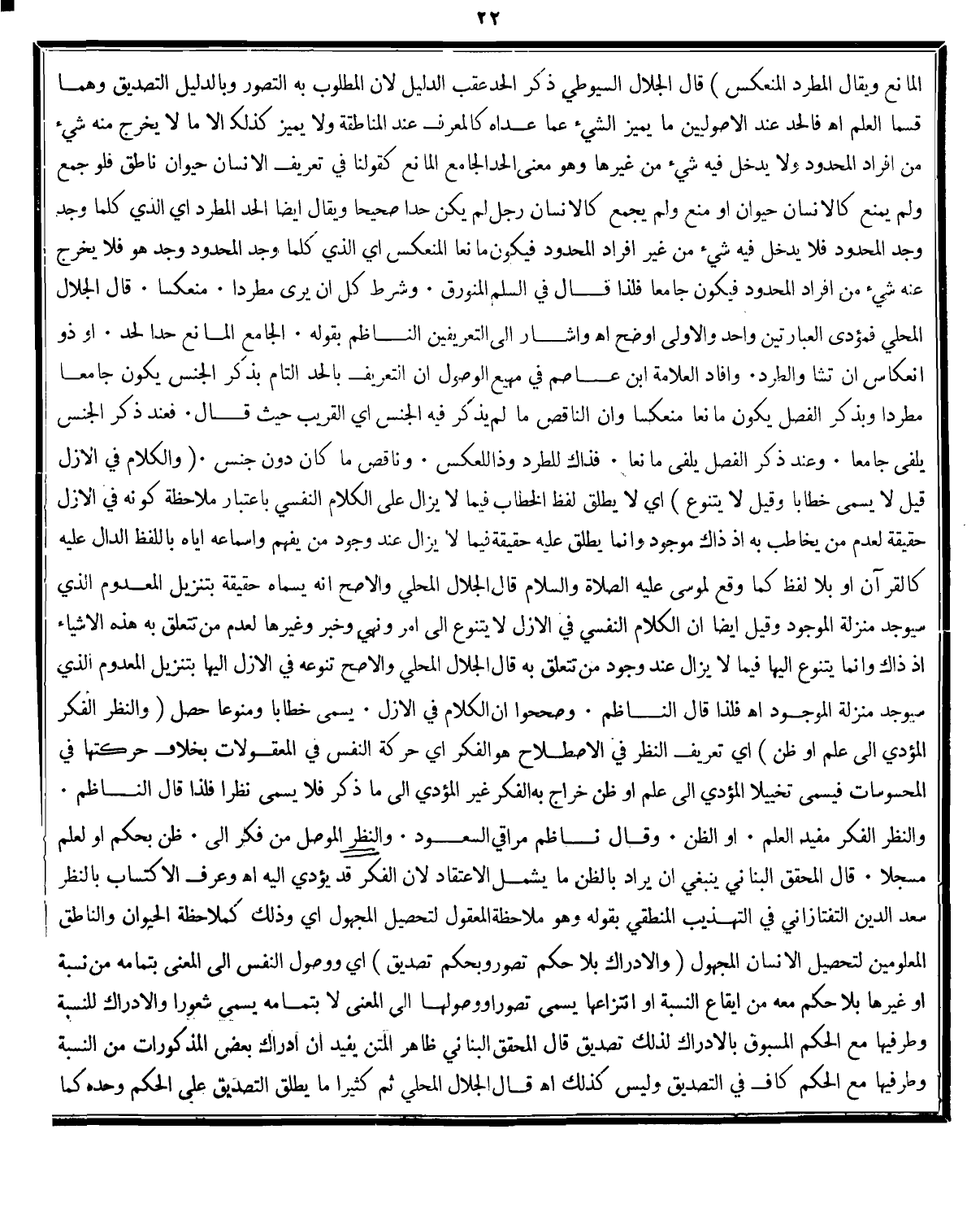 الْمَانِعُ الْمُطَّرِدُ الْمُنْعَكِسُ) قال الجلال السيوطى ذكر الحد عقيب الدليل لان المطلوب به التصور وبالدليل التصديق وهما قسما العلم اه.