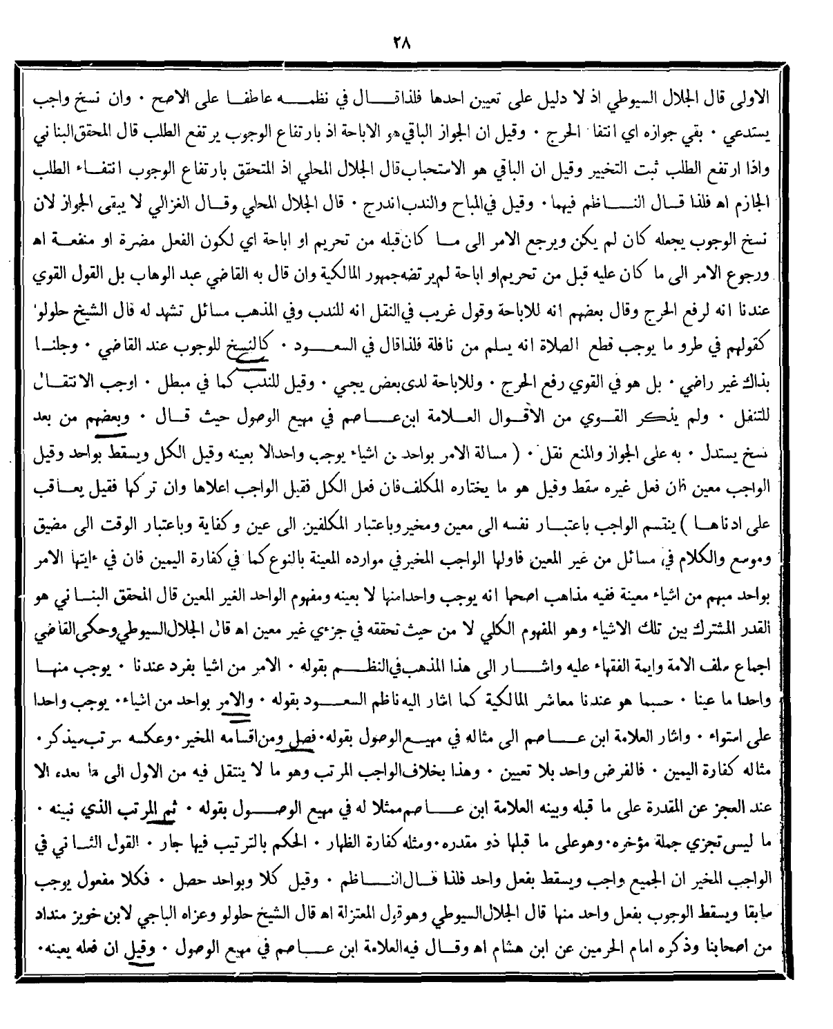 (مَسْأَلَةُ الْأَمْرِ بِوَاحِدٍ مِنْ أَشْيَاءَ يُوجِبُ وَاحِدًا لَا بِعَيْنِهِ وَقِيلَ الْكُلَّ وَيَسْقُطُ بِوَاحِدٍ وَقِيلَ الْوَاجِبُ مُعَيَّنٌ فَإِنْ فَعَلَ غَيْرُهُ سَقَطَ وَقِيلَ هُوَ مَا يَخْتَارُهُ الْمُكَلَّفُ فَإِنْ فَعَلَ الْكُلُّ فَقِيلَ الْوَاجِبُ أَعْلَاهَا وَإِنْ تَرَكَهَا فَقِيلَ: يُعَاقَبُ عَلَى أَدْنَاهَا) ينقسم الواجب باعتباره نفسه الى معين ومخير وباعتبار المكلفين الى عين وكفاية وباعتبار الوقت الى مضيق وموسع والكلام فى مسائل من غير المعين فاولها الواجب المخير فى موارده المعينة بالنوع كما فى كفارة اليمين فان فى ءايتها الامر بواحد مبهم من اشياء بين تلك الاشياء وهو المفهوم الكلى لا من حيث تحققه فى جزئ غير معين اه.