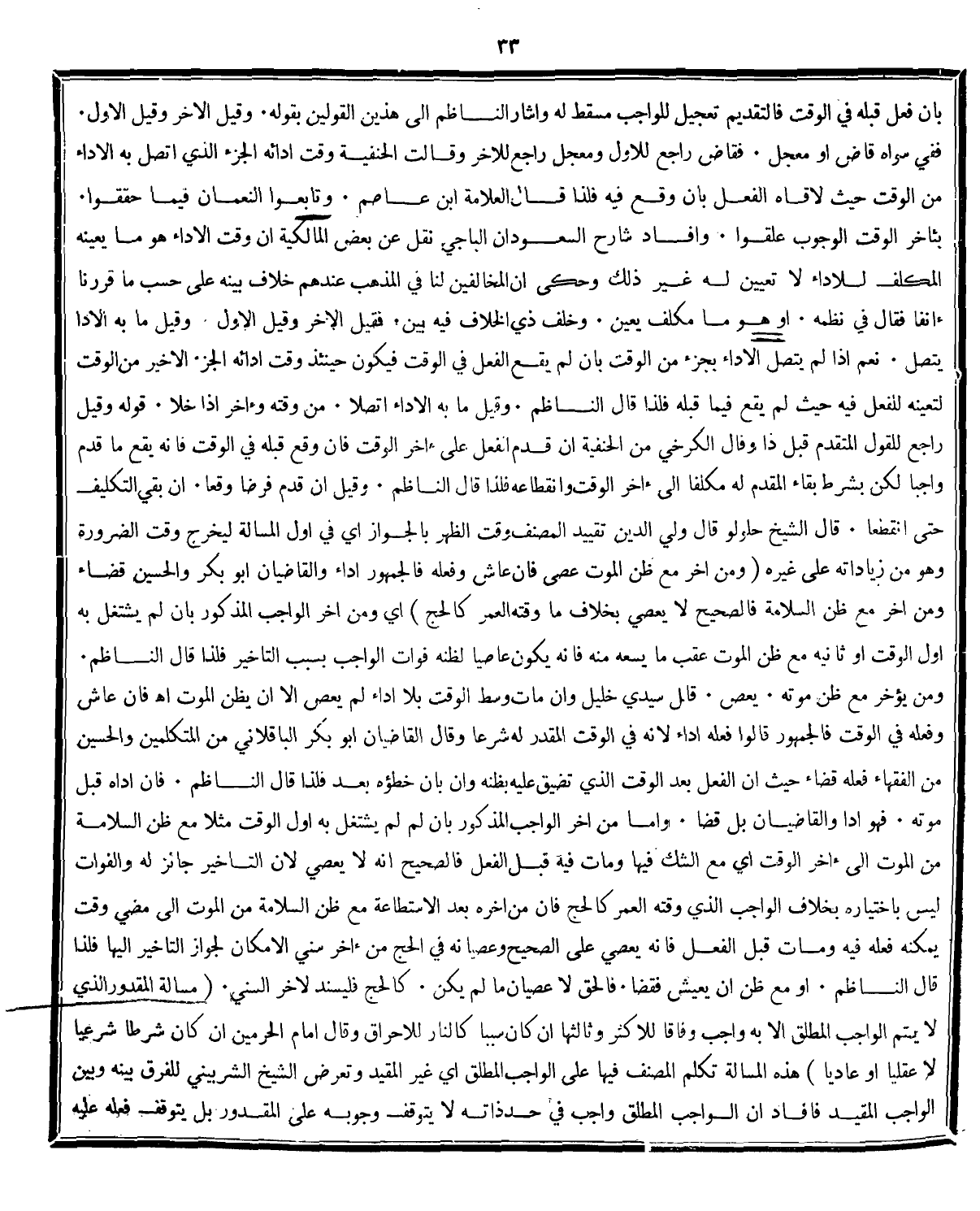وافاد شارح السعود ان الباجى نقل عن بعض المالكية ان وقت الاداء هو ما يعينه المكلف للاداء لاتعيين له غير ذلك وحكى ان المخالفين لنا فى المذهب عندهم خلاف بينه على حسب ما قررنا ءانفا فقال في نظمه: أو هو ما مكلف يُعيِّن....وخلف ذي الخلاف فيه بيِّن