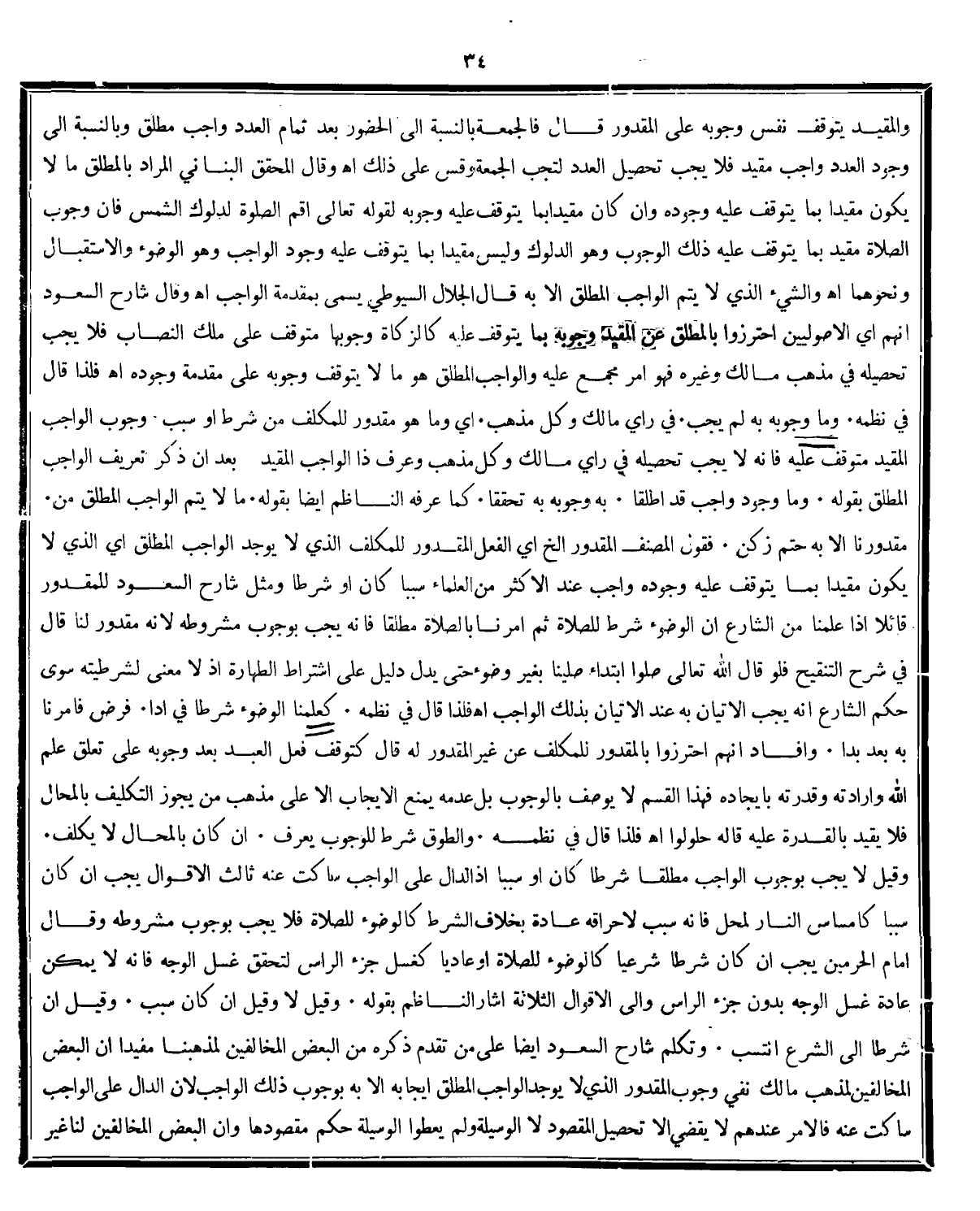 والمقيد يتوقف نفس وجوبه على المقدور قال فالجمعة بالنسبة الى المحضور بعد تمام العدد واجب مطلق وبالنسبة الى وجود العدد واجب مقيد فلا يجب تحصيل العدد لتجب الجمعة على ذلك اه. وقال المحقق البنانى المراد بالمطلق مالا يكون مقيدا بما يتوقف عليه وجوده وان كان مقيدا بمايتوقف عليه وجوبه لقوله تعالى (أَقِمِ الصَّلَاةَ لِدُلُوكِ الشَّمْسِ) فان وجوب الصلاة مقيد بما يتوقف عليه ذلك الوجوب وهو الدلوك وليس مقيدا بما يتوقف عليه وجود الواجب وهو الوضوء والاستقبال ونحوهما اه. والشيء الذي لا يتم الواجب المطلق الا به قال الجلال السيوطى يسمى بمقدمة الواجب اه. وقال شارح السعود انهم أي الاصوليين احترزوا بالمطلق عن المقيد وجوبه بما يتوقف عليه كالزكاة وجوبها متوقف على ملك النصاب فلا يجب تحصيله فى مذهب مالك وغيره فهو امر مجمع عليه والواجب المطلق هو ما لا يتوقف وجوبه على وجوده اه. فلذا قال فى نظمه: