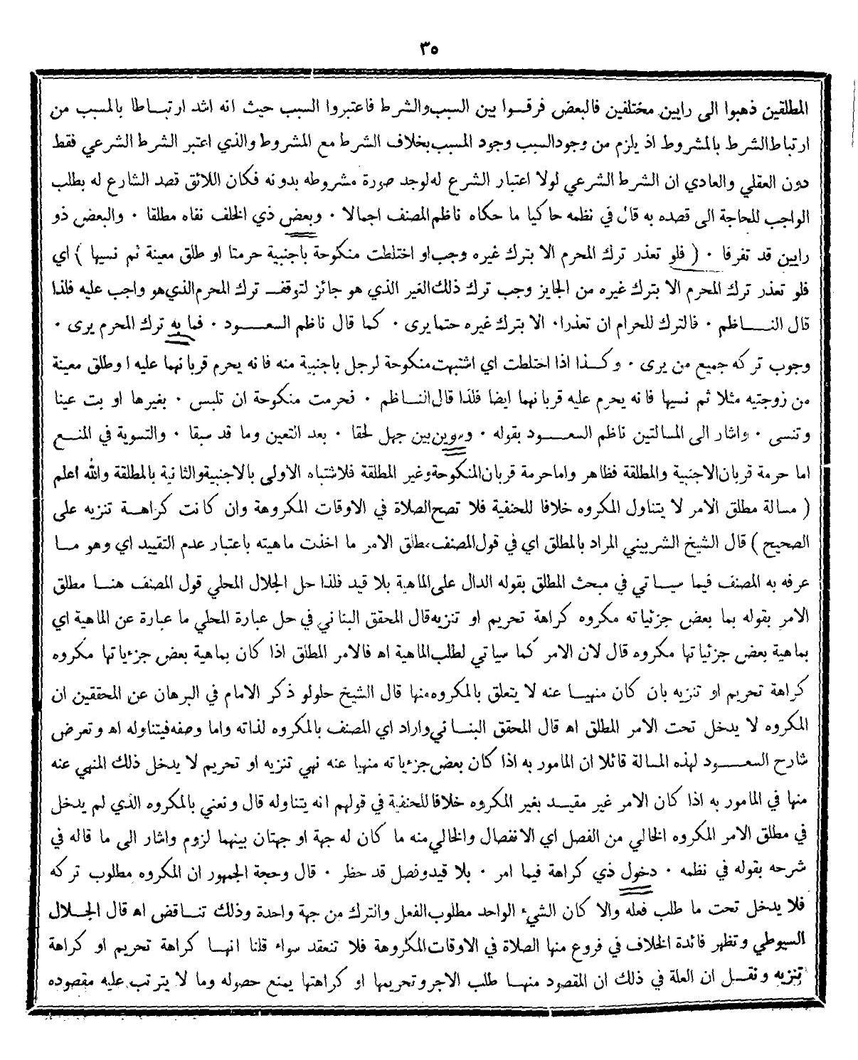 المطلقين ذهبوا الى رايين مختلفين فالبعض فرقوا بين السبب والشرط فاعتبروا السبب حيث انه اشد ارتباطا بالمسبب من ارتباط الشرط بالمشروط اذ يلزم من وجود السبب وجود المسبب بخلاف الشرط مع المشروط والذي اعتبر الشرط الشرعى فقط دون العقلى والعادى ان الشرط الشرعى لولا اعتبار الشرع له لوجد صورة مشروطه بدونه فكان اللائق قصد الشارع له بطلب الواجد للحاجة الى قصده به قال فى نظمه حاكياماحكاه ناظم المصنف اجمالا: