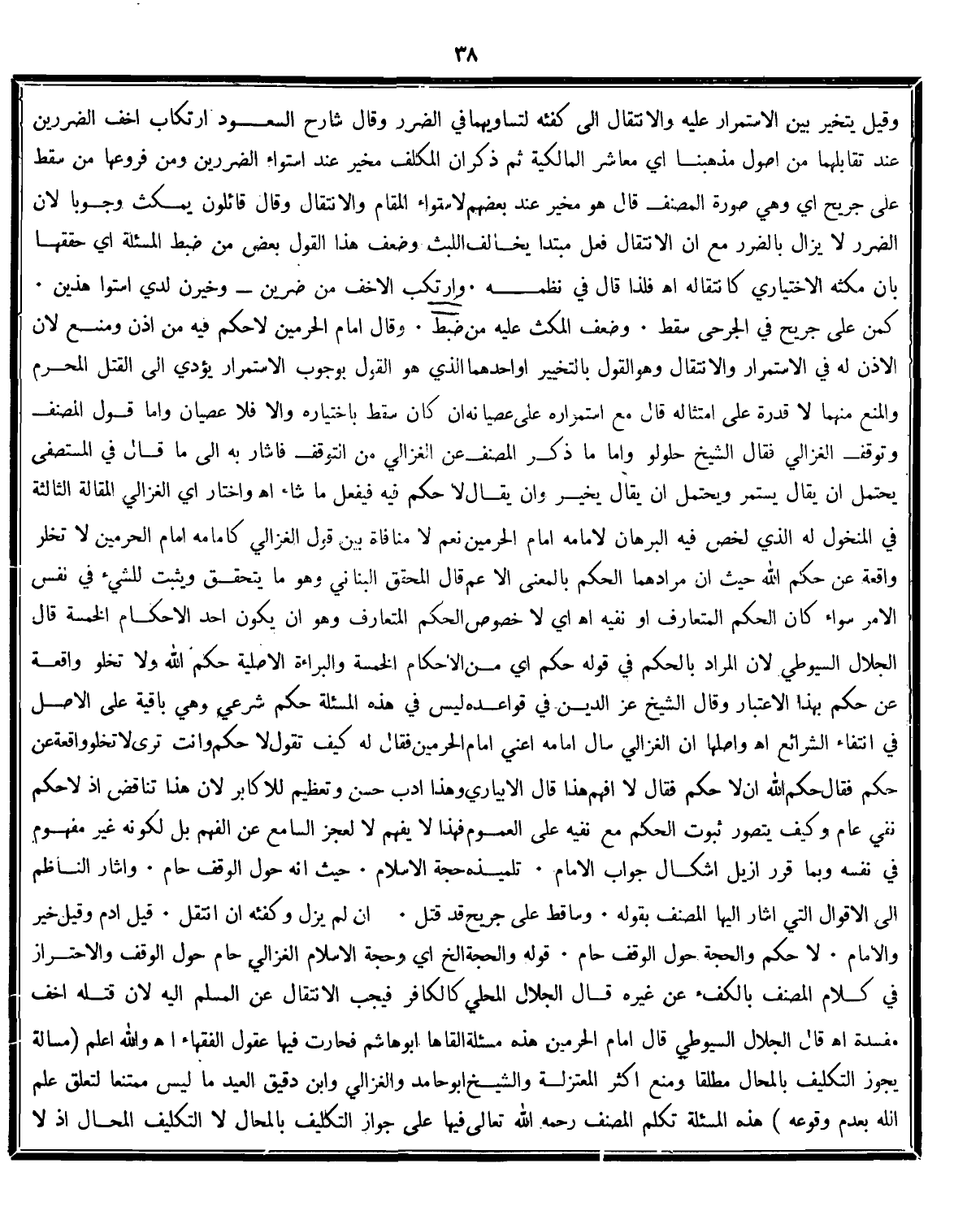 قال امام الحرمين لا حكم فيه من اذن ومنع لان الاذن له فى الاستمرار والانتقال وهو القول بالتخيير او احدهما الذي هو القول بوجوب الاستمرار يؤدي الى القتل المحرم والمنع منهما لاقدرة على امتثاله قال مع استمراره على عصيانه ان كان سقط باختياره والا فلا عصيان واما قول المصنف وتوقف الغزالى فقال الشيخ حلولو واما ماذكر المصنف عن الغزالى من التوقف فاشار به الى ما قال فى المستصفى يحتمل ان يقال يستمر ويحتمل ان يقال يخير وان يقال لا حكم فيه فيفعل ما شاء اه. واختار أي الغزالي المقالة الثالثة فى المنخول له الذي لخص فيه البرهان لامامه امام الحرمين نعم لا منافاة بين قول الغزالى كامامه امامه الحرمين لا تخلو واقعة عن حكم الله حيث ان مرادهما الحكم بالمعنى الاعم قال المحقق البنانى وهو ما يتحقق ويثبت للشيء فى نفس الامر سواء كان الحكم المتعارف او نفيه اه. أي لا خصوص الحكم المتعارف وهو ان يكون الاحكام الخمسة قال الجلال السيوطى لان المراد بالحكم فى قوله حكم أي من الاحكام الخمسة والبرءاة الاصلية حكم الله ولا تخلو واقعة عن حكم بهذا الاعتبار وقال الشيخ عزالدين في قواعده ليس فى هذه المسالة حكم شرعي وهى باقية على الاصل فى انتفاء الشرع اه. واصلها ان الغزالى سال امامه اعنى امام الحرمين فقال له كيف تقول لا حكم وانت تري لا تخلو واقعة عن حكم فقال حكم الله ان لا حكم فقال لا افهم هذا قال الابياري وهذا ادب حسن وتعظيم للاكابر لان هذاتناقض اذ لا حكم نفى عام وكيف يتصور ثبوت الحكم مع نفيه على العموم فهذا لا يفهم لا لعجز السامع عن الفهم بل لكونه غير مفهوم فى نفسه وبما قرر ازيل اشكال جواب الامام. تلميذه حجة الاسلام.... حيث انه حول الوقف حام