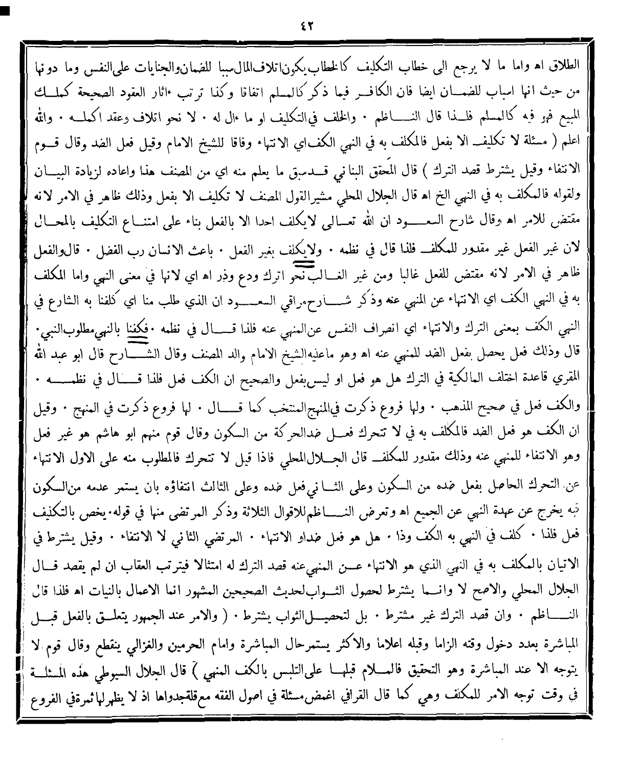 قال وذلك فعل يحصل بفعل الضد للمنهى عنه اه. وهوما عليه الشيخ الامام والد المصنف وقال الشارح قال ابو عبد الله المقري قاعد اختلف المالكية فى الترك هل هو فعل اوليس بفعل والصحيح ان الكف فعل فلذاقال في نظمه:....والترك فعل في صحيح المذهب