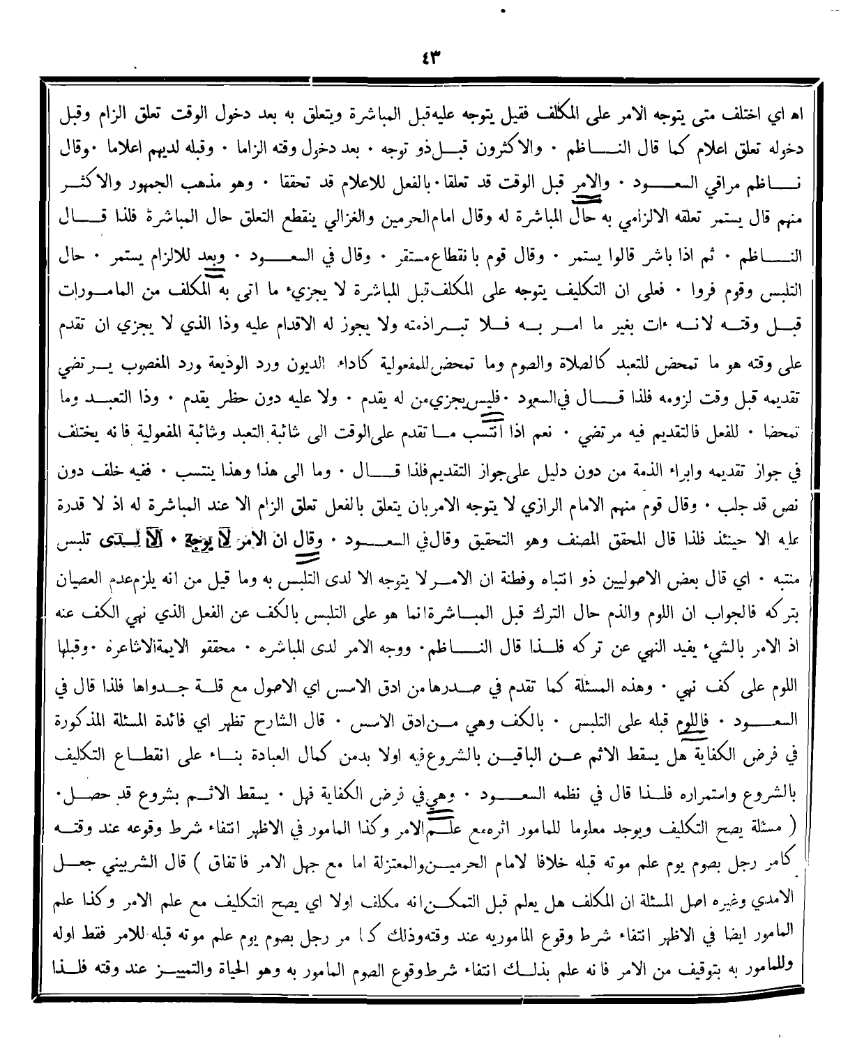 أي قال بعض الاصوليين ذو انتباه وفطنة ان الامر لايتوجه الا لدي التلبس به وما قيل من انه يلزم عدم العصيان بتركه فالجواب ان اللوم والذم حال الترك قبل المباشرة انما هوعلى التلبس بالكف عن الفعل الذي نهى الكف عنه اذ الا بالشيء يفيد النهى عن تركه فلذاقال الناظم: وَوَجَّهَ الأَمْرَ لَدَى الْمُبَاشَرَهْ ... مُحَقَّقُو الأَئِمَّةِ الأَشَاعِرَهْ