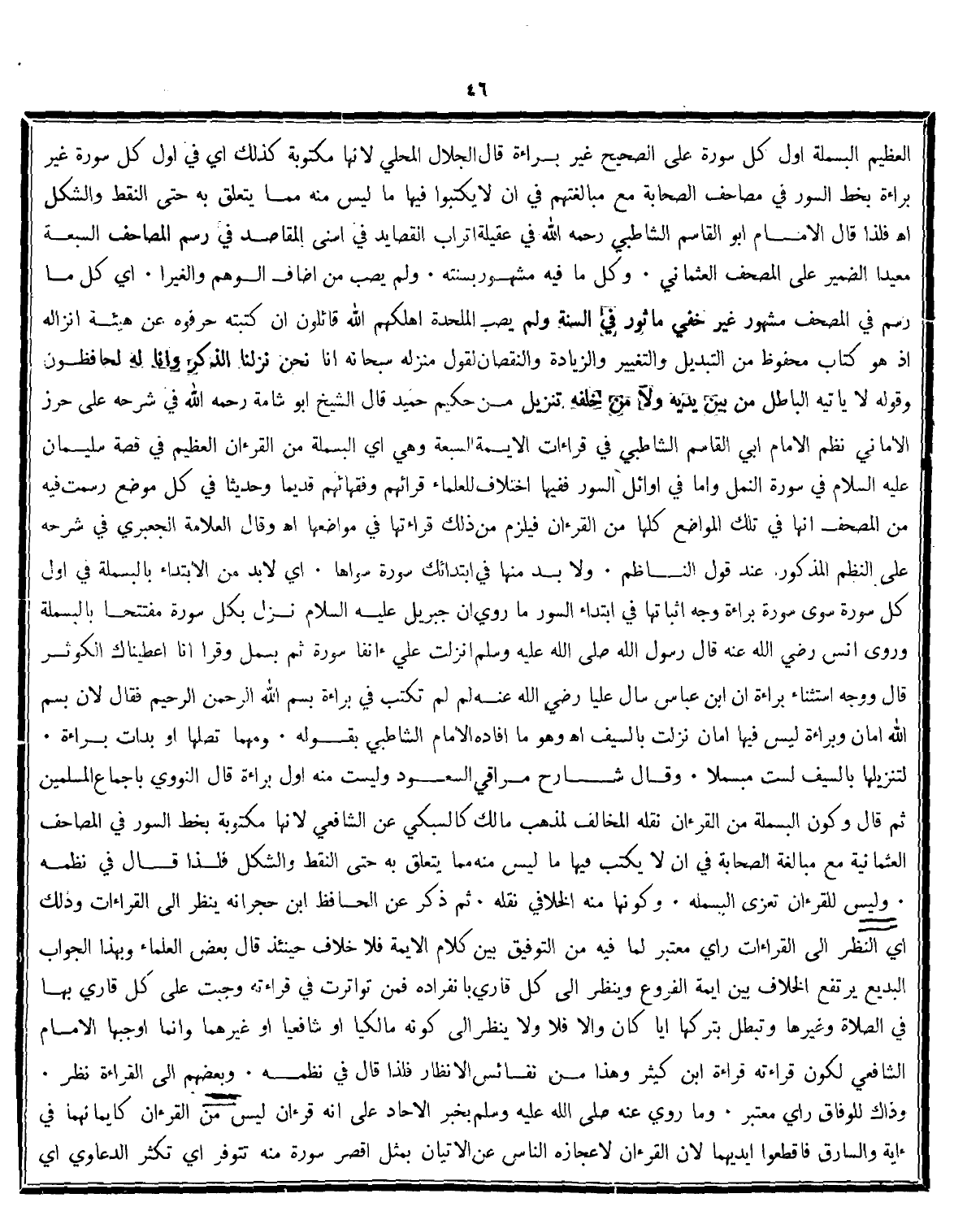 العظيم البسملة اول كل سورة على الصحيح غير براءة قال الجلال المحلى: لِأَنَّهَا مَكْتُوبَةٌ كَذَلِكَ بِخَطِّ السُّوَرِ فِي مَصَاحِفِ الصَّحَابَةِ مَعَ مُبَالَغَتِهِمْ فِي أَنْ لَا يُكْتَبَ فِيهَا مَا لَيْسَ مِنْهُ مِمَّا يَتَعَلَّقُ بِهِ حَتَّى النَّقْطُ وَالشَّكْلُ اه. قال الاما ابو القاسم الشاطبى رحمه الله فى عقيلة اتراب القصائد فى اسنى المقاصد فى رسم المصاحف السبعة