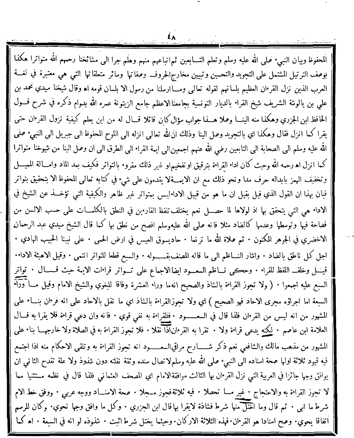 المحفوظ وبيان النبئ صلى الله عليه وسلم التابعين ثم اتباعهم منهم وهلم جرا الى مشائخنا رحمهم الله تعالى متواترة هكذا بوصف التنزيل الترتيل المشتمل على التجويد والتحسين وتبيين مخارج الحروف وصفاتها وسائر متعلقاتها التى معتبرة فى لغة العرب الذين نزل القرءان العظيم بلسانهم لقوله تعالى: وَمَا أَرْسَلْنَا مِنْ رَسُولٍ إِلَّا بِلِسَانِ قَوْمِهِ اه. وقال شيخنا سيدي محمد بن على بن يالوشة الشريف شيخ القراء بالديار التونسية بجامعنا الزيتونة عمره الله بدوام ذكره فى شرح قول الحافظ ابن الجزري وهكذا منه الينا هذا جواب سؤال كان قائلا قال له من اين يعلم كيفية نزول القرءان حتى يقراء كما انزل فقال وهكذا أي بالتجويد وصل الينا وذلك ان الله تعالى انزله الى اللوح المحفوظ الى جبريل الى النبى صلى الله عليه وسلم الى الصحابة الى التابعين رضى الله عنهم اجمعين الى ائمة القراء الى الطرق الى ان وصل الينا من شيوخنا متواترا كما انزله اه. رحمه الله وحيث كان اداء القراءة بترقيق او تفخيم اوغير ذلك مقروء بالتواتر فكيف بمد الماد وامالة الميل وتخفيف الهمز بابداله حرف مدا ونحو ذلك مع ان الائمة لايقدمون على شيء فى كتابه تعالى المحفوظ الا بتحقيق بتواتر فبان بهذا ان القول الذي قيل بقيل ان ما هو من قبيل الاداء بمتواتر غير ظاهر والكيفية التى تؤخذ عن الشيخ فى الاداء هى التى يتحقق بها اذ لولاها لما حصل نعم يختلف تلفظ القارئين فى النطق بالكلمات على حسب الالسن من فصاحة فيها وتوسطها وعدمها كالضاد مثلا فانه صلى الله عليه وسلم افصح من نطق بهاكماقال الشيخ سيدي عبد الرحمان الاخضري فى الجوهر المكنون ك: