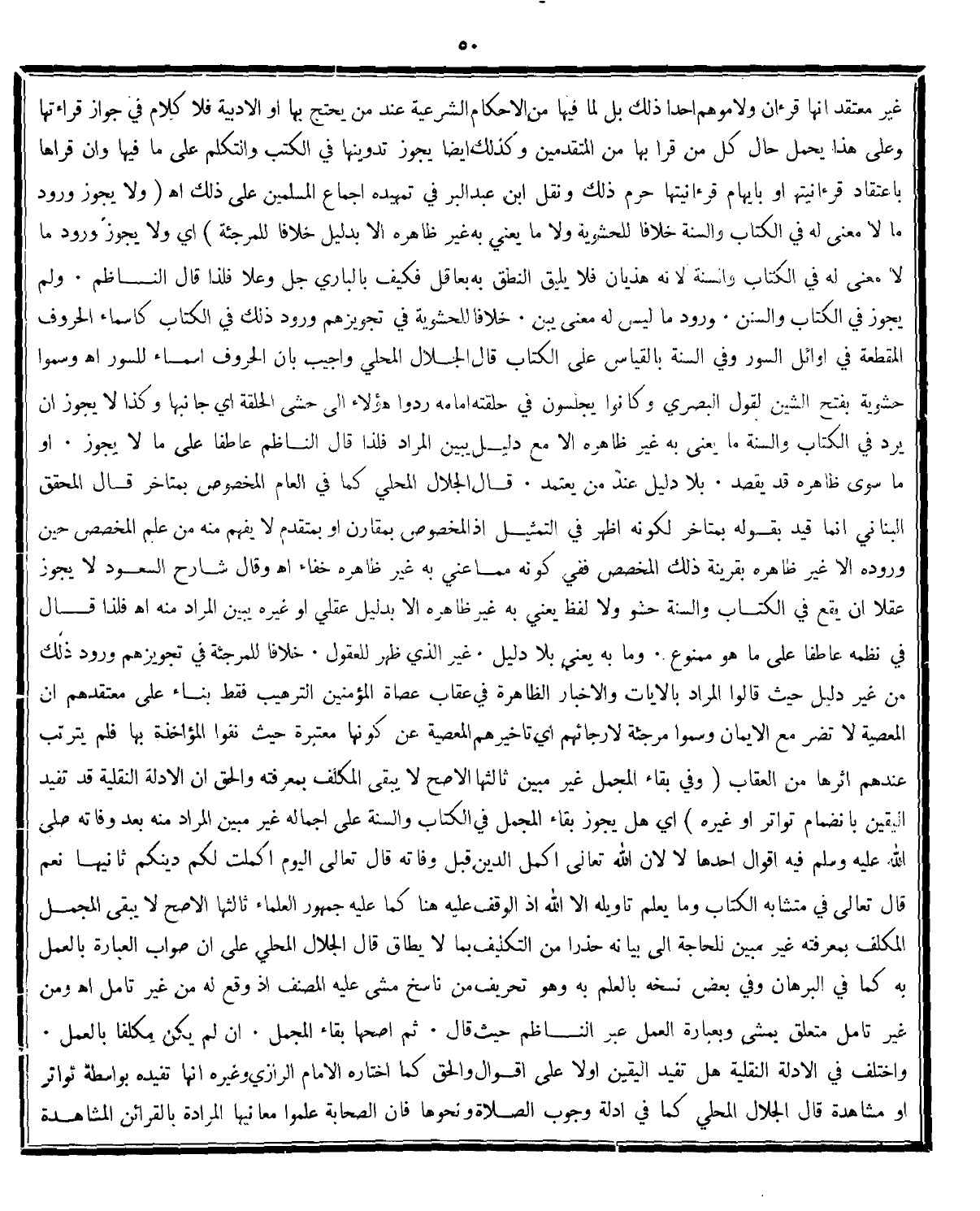 خلاف للحشوية فى تجويزهم ورود ذلك فى الكتاب كاسماء الحروف المقطعة فى اوائل السور وفى السنة بالقياس على الكتاب قال الجلال المحلى: وَأُجِيبَ بِأَنَّ الْحُرُوفَ أَسْمَاءٌ لِلسُّوَرِ اه. وَسُمُّوا حَشَوِيَّةً بفتح الشين لقول البصري وَكَانُوا يَجْلِسُونَ فِي حَلْقَتِهِ رَدواهَؤُلَاءِ إلَى حَشْيِ الْحَلْقَةِ أَيْ جَانِبِهَا وكذا لا يجوزون ان ايرد فى الكتاب والسنة ما يعنى به غير ظاهره الا مع دليل يبين المراد فلذاقال الناظم عاطفا على مالايجوز:
