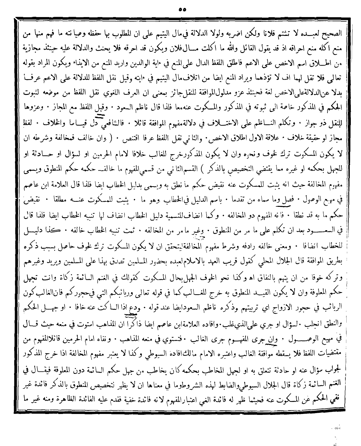 ومعنى خالفه رادفه وشرط مفهوم المخالفة ليتحقق ان لايكون المسكوت ترك لخوف حاصل بسبب ذكره بطريق الموافقه قال الجلال المحلى:
