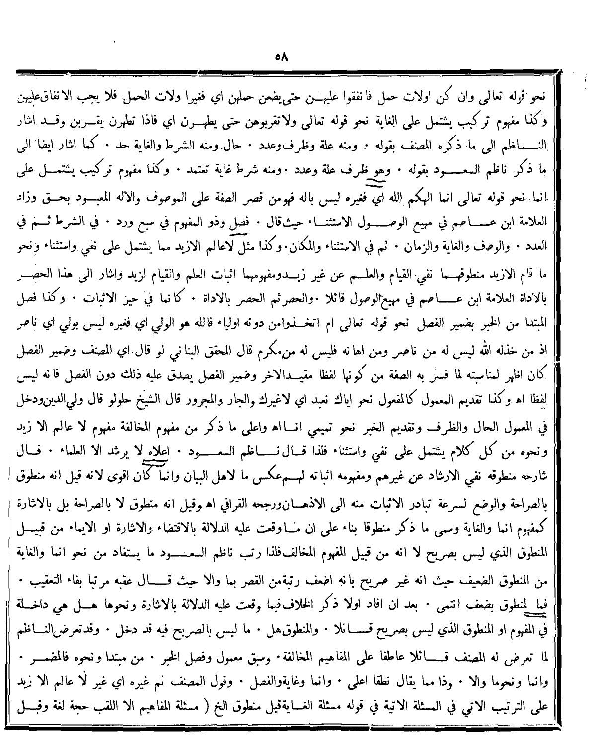 أعلاه لا يرشد إلا العلما.. قال شارحه منطوقه نفى الارشاد عن غيرهم ومفهومه اثباته لهم عكس مالاهل البيان وانما كان اقوي لانه قيل انه منطوق بالصراحة والوضع لسرعة تبادر الاثبات منه الى الاذهان ورجه القرافى اه. وقيل انه منطوق لا باالصراحة بل بالاشارة كمفهوم انما والغاية وسمى ماذكر منطوقا بناء على ان ما وقعت عليه الدلالة بالاقتضاء والاشارة اوالايماء من قبيل المنطوق الذي ليس بصريح لاانه من قبيل المفهوم المخالف فلذا رتب ناظم السعود ما يستفاد من نحو انما والغاية من المنطوق الضعيف حيث انه غير صريح بانه اضعف رتبة من القصر بما والا حيث قال عقبه بفاء التعقيب: