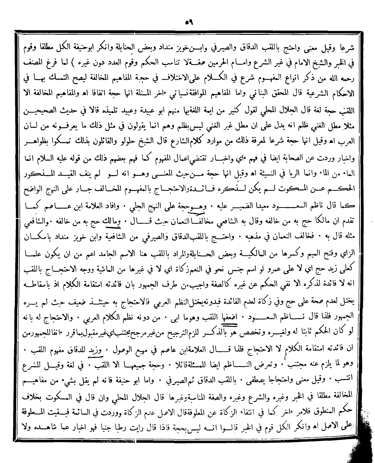 شَرْعًا وَقِيلَ مَعْنًى وَاحْتَجَّ بِاللَّقَبِ الدَّقَّاقُ وَالصَّيْرَفِيُّ وَابْنُ خُوَيْزِ مِنْدَادْ وَبَعْضُ الْحَنَابِلَةِ وَأَنْكَرَ أَبُو حَنِيفَةَ الْكُلَّ مُطْلَقًا وَقَوْمٌ فِي الْخَبَرِ وَالشَّيْخُ الْإِمَامُ فِي غَيْرِ الشَّرْعِ وَإمَامُ الْحَرَمَيْنِ صِفَةً لَا تُنَاسِبُ الْحُكْمَ وَقَوْمٌ الْعَدَدَ دُونَ غَيْرِهِ) لما فرغ المنصف رحمه الله من ذكر انواع المفهوم شرع فى الكلام على الاختلاف فى حجية المفاهيم المخالفة ليصح التمسك بها فى الاحكام الشرعية قال المحقق البنانى واما الفاهيم الموافقة فسياتى ءاخر المسألة انها حجة اتفاقا اه. والمفاهيم المخالفة الا اللقب حجة لغة قال الجلال لِقَوْلِ كَثِيرٍ مِنْ أَئِمَّةِ اللُّغَةِ بِهَا مِنْهُمْ أَبُو عُبَيْدَةَ وَعُبَيْدٌ تِلْمِيذُهُ قَالَا فِي حَدِيثِ الصَّحِيحَيْنِ مَثَلًا {مَطْلُ الْغَنِيِّ ظُلْمٌ} أَنَّهُ يَدُلُّ عَلَى أَنَّ مَطْلَ غَيْرِ الْغَنِيِّ لَيْسَ بِظُلْمٍ وَهُمْ إنَّمَا يَقُولُونَ فِي مِثْلِ ذَلِكَ مَا يَعْرِفُونَهُ مِنْ لِسَانِ الْعَرَبِ اه. وقيل انها شرعا لمعرفة ذلك من موارد كلام الشارع قال الشيخ حلولو والقائلون بذلك تمسكوا بظواهر واخبار وردت عن الصحابة ايضا فى فهم ءاي واخبار تقتضى اعمال المفهوم كما فهم بعضهم ذلك من قوله عليه السلام (انما الماء من الماء) و (انما الربا فى النسيئة) اه. وقيل انها حجة شرعية من حيث المعنى وهو انه لو لم ينف القيد المذكور الحكم عن المسكوت لم يكن لذكره فائدة والاحتجاج بالمفهوم المخالف جار على النهج الواضح كما قال ناظم السعود معيدا الضمير عليه: