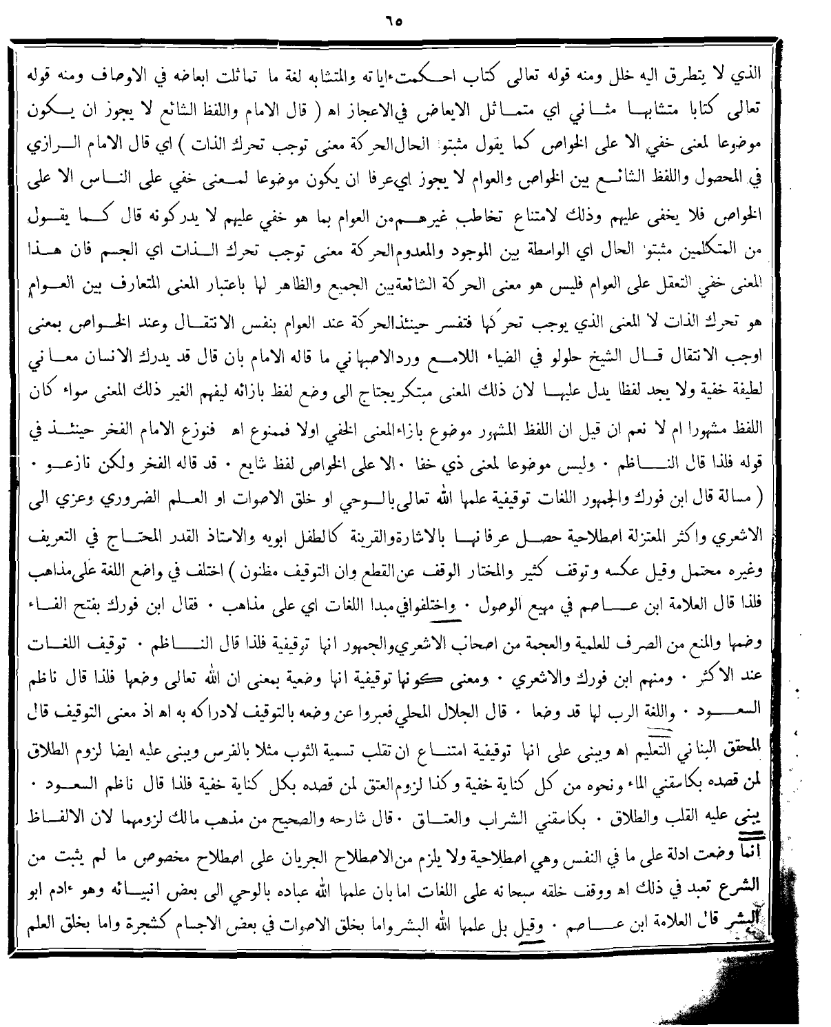 الذي لا يتطرق اليه خلل ومنه قوله تعالى (كِتَابٌ أُحْكِمَتْ آَيَاتُهُ) والمتشابه لغة ما تماثلت ابعاضه فى الاوصاف ومنه قوله تعالى (كِتَابًا مُتَشَابِهًامَثَانِيَ) أي متماثل الابعاض فى الاعجاز اه. (قَالَ الْإِمَامُ وَاللَّفْظُ الشَّائِعُ (لَا يَجُوزُ أَنْ يَكُونَ مَوْضُوعًا لِمَعْنًى خَفِيٍّ إلَّا عَلَى الْخَوَاصِّ كَمَا يَقُولُ مُثْبِتُو الْحَالِ الْحَرَكَةُ مَعْنًى تُوجِبُ تَحَرُّكَ الذَّاتِ) أي قال الامام الرازي فى المحصول واللفظ الشائع بين الخواص والعوام لا يجوز أي عرفا ان يكون موضوعا لمعنى خفي على الناس الا على الخواص فلا يخفى عليهم وذلك لامتناع تخاطب غيرهم من العوام بما هو خفى عليهم لا يدركونه قال كما يقول من المتكلمين مثبتوالحال أي الواسطة بين الموجود والمعدوم الحركة معنى توجب تحرك الذات أي الجسم فان هذا المعنى خفى على العوام فليس هو معنى الحركة الشائعة بين الجميع والظاهر لها باعتبار المعنى المتعارف بين العوام هوتحرك الذات لاالمعنى الذي يوجب تحركها فتفسر حينئذ الحركة عند العوام بنفس الانتقال وعند الخواص بمعنى اوجب الانتقال قال الشيخ حلولو فى الضياء اللامع ورد الاصبهانى ما قاله الامام بان قال قد يدرك الانسان معانى لطيفة خفية ولايجد لفظا يدل عليها لان ذلك المعنى مبتكر يحتاج الى وضع لفظ بازائه ليفهم الغير ذلك المعنى سواء كان اللفظ مشهورا ام لا نعم ان قيل ان اللفظ المشهور موضوع بازاء المعنى الخفى اولافممنوع اه. قد قاله الفخر حينئذ فى قوله فلذا قال الناظم: