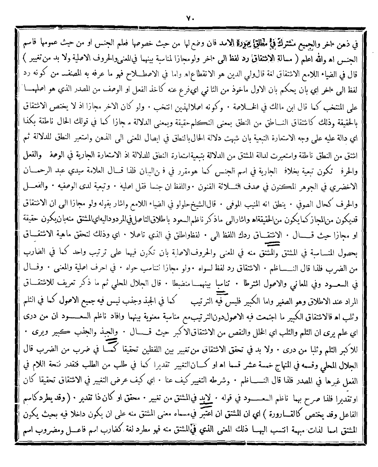 ولو كان الاخر مجاز اذلا يختص الاشتقاق بالحقيقة وذلك كاشتقاق الناطق من النطق بمعنى التكلم حقيقة وبمعنى الدلالة مجازا كما فى قولك الحال ناطقة بكذا أي دالة عليه على وجه الاستعارة التبعية بان شبهت دلالة الحال بالنطق فى ايصال المعنى الى الذهن واستعير النطق لدلالة ثم اشتق من النطق ناطقة واستعيرت لدالة المشتق من الدلالة بتبعية استعارة النطق للدلالة اذ الاستعارة الجارية فى الوصف والفعل والحرف تكون تبعية بخلاف الجارية فى اسم الجنس كما هو مقرر فى فن البيان فلذا قال العلامة سيدي عبد الرحمان الاخضري فى الجوهرالمكنون فى صدف الثلاثة الفنون: