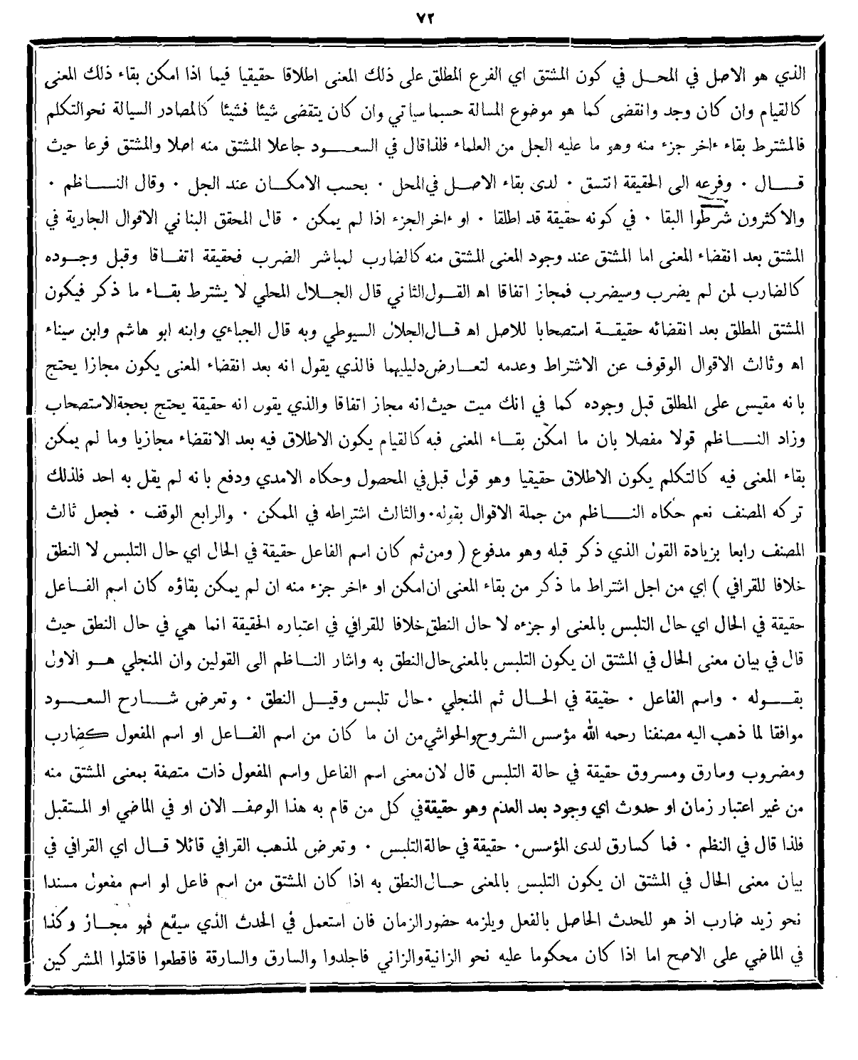 وتعرض شارح السعود موافقا لماذهب اليه مصنفنا رحمه الله مؤسس الشروح والحواشى من ان كان من اسم الفاعل اواسم المفعول كضارب ومضروب وسارق ومسروق حقيقة فى حالة التلبس قال لان معنى اسم الفاعل واسم المفعول ذات متصفة بمعنى المشتق منه من غير اعتبار زمان او حدوث أي وجود بعد العدم وهو حقيقة فى كل من قام به هذا الوصف الان او فى الماضى او المستقبل فلذا قال فى النظم: