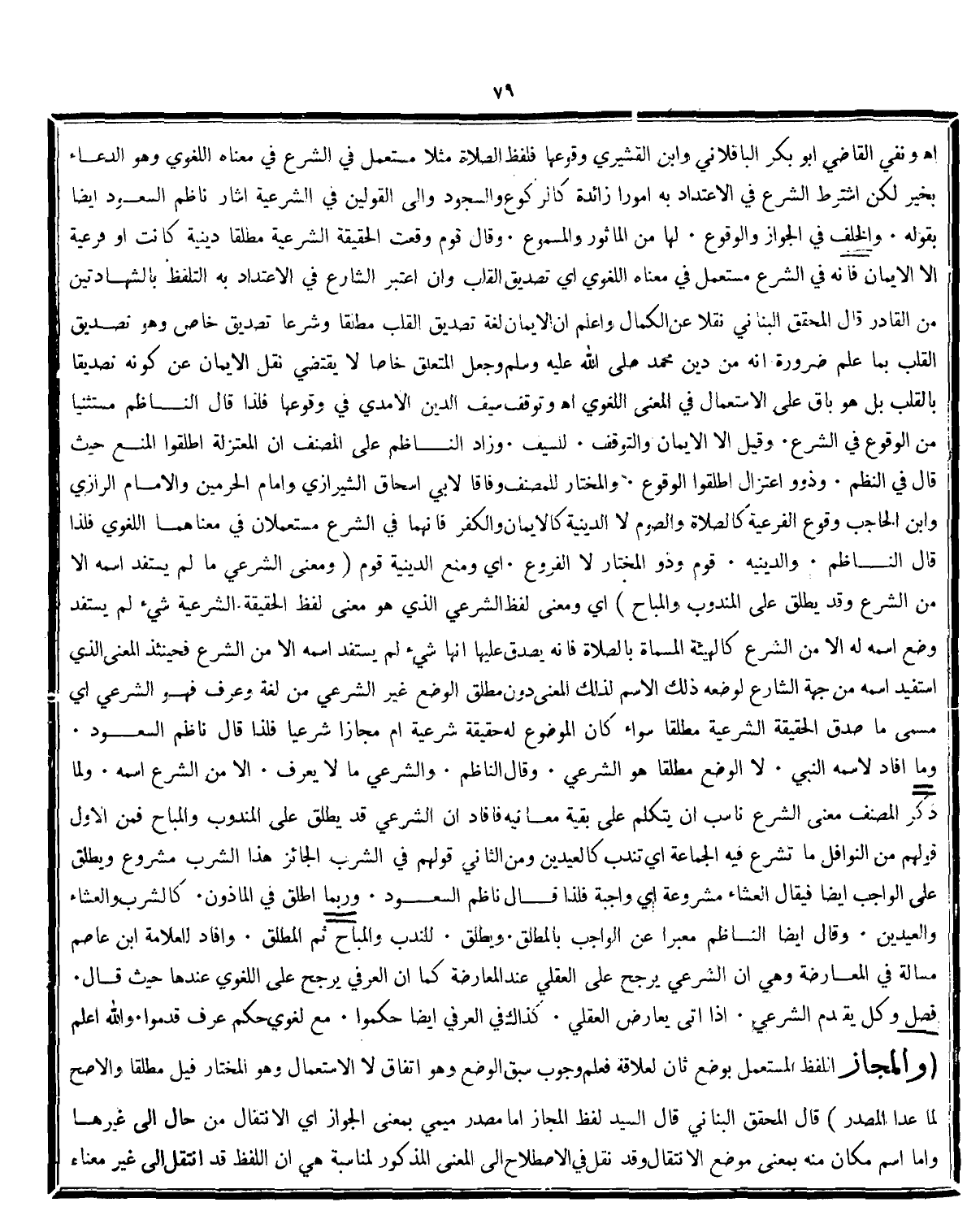 وقال قوم وقعت الحقيقة الشرعية مطلقا دينية كانت او فرعية الا الايمان فانه فى الشرع مستعمل فى معناه اللغوي أي تصديق القلب وان اعتبر الشارع فى الاعتداد به التلفظ بالشهادتين من القادر قال المحقق البنانى نقلا عن الكمال واعلم ان الايمان لغة تصديق القلب مطلقا وشرعا تصديق خاص وهو تصديق القلب بماعلم ضرورة انه من دين محمد صلى الله عليه وسلم وجعل المتعلق خاصا لا يقتضى نقل الايمان عن كونه تصديقا بالقلب بل هو باق على الاستعمال فى المعنى اللغوي اه. وتوقف سيف الدين الامدي وقوعها فلذا قال الناظم مستثنيا من الوقوع فى الشرع: