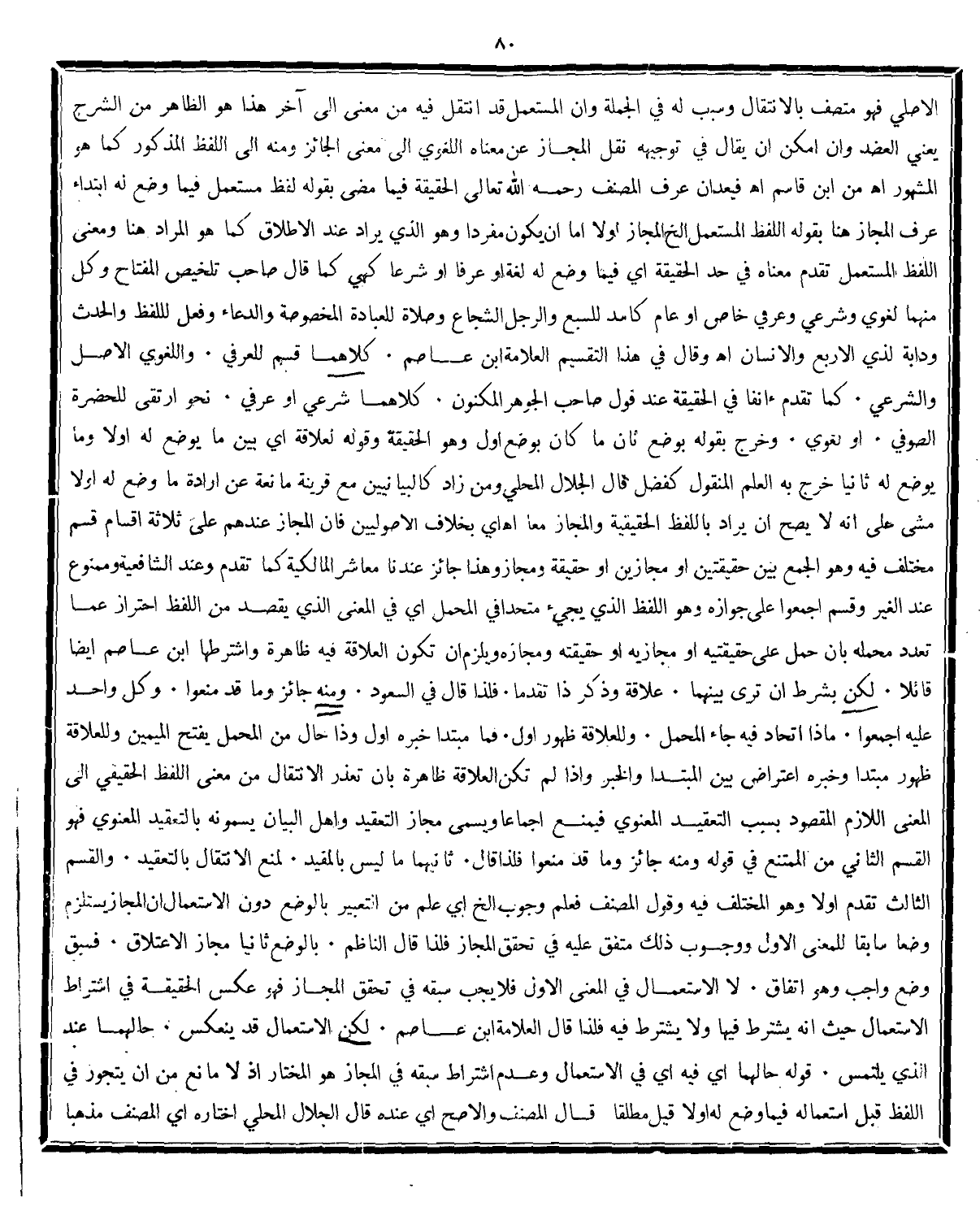 وَمَنْ زَادَ كَالْبَيَانِيِّينَ مَعَ قَرِينَةٍ مَانِعَةٍ عَنْ إرَادَةِ مَا وُضِعَ لَهُ أَوَّلًا مَشَى عَلَى أَنَّهُ لَا يَصِحُّ أَنْ يُرَادَ بِاللَّفْظِ الْحَقِيقَةُ وَالْمَجَازُ مَعًا اه. أي بخلاف الاصوليين فان المجاز عندهم على ثلاثة اقسام قسم مختلف فيه وهو الجمع بين حقيقتين او مجازين او حقيقة ومجاز وهذا جائز عندنا معاشر المالكية كما تقدم وعند الشافعية وممنوع عند الغير وقسم اجمعوا على جوازه وهو اللفظ الذي يجيء متحدا فى المحمل أي فى المعنى الذي يقصد من اللفظ احتراز عماتعدد محمله بان حمل على حقيقة او مجازية او حقيقته ومجازه ويلزم ان تكون العلاقة فيه ظاهرة واشترطها ابن عاصم ايضا قائلا: