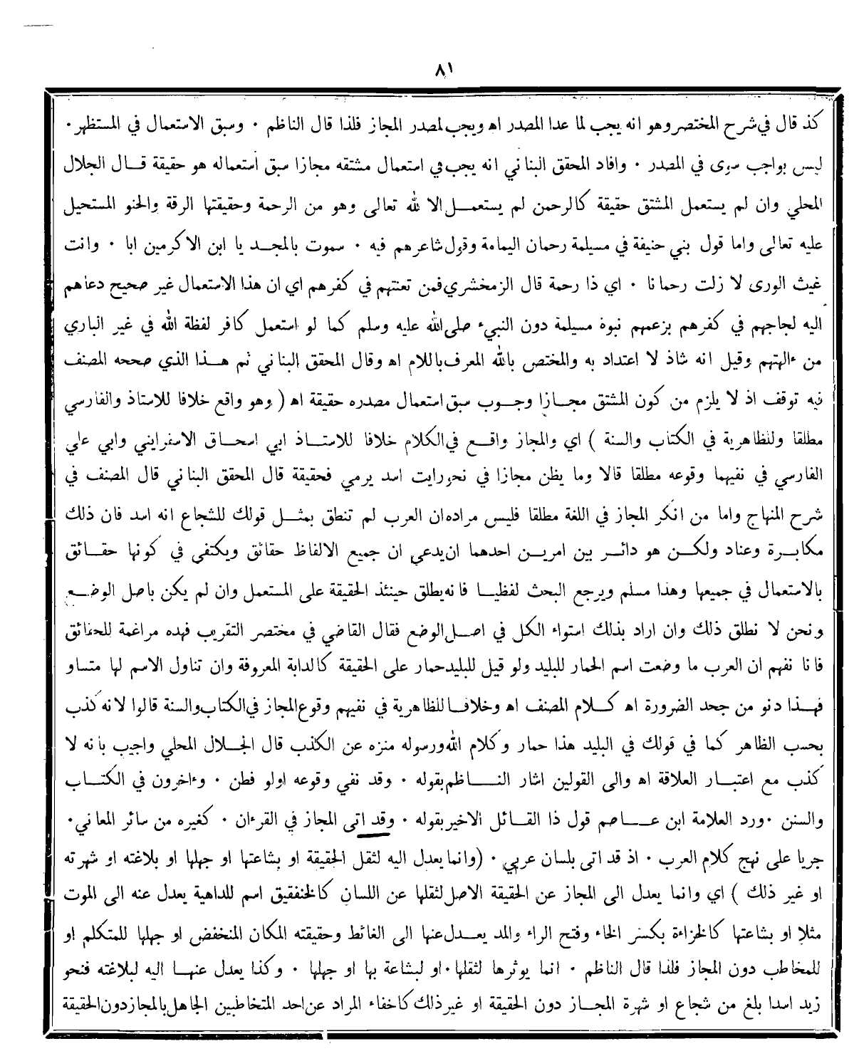 وافاد المحقق البنانى انه يجب فى استعماله مشتقة مجاز سبق استعماله هو حقيقة قال الجلال المحلى: وَإِنْ لَمْ يُسْتَعْمَلْ الْمُشْتَقُّ حَقِيقَةً كَالرَّحْمَنِ لَمْ يُسْتَعْمَلْ إلَّا لِلَّهِ تَعَالَى وَهُوَ مِنْ الرَّحْمَةِ وَحَقِيقَتُهَا الرِّقَّةُ وَالْحُنُوُّ الْمُسْتَحِيلُ عَلَيْهِ تَعَالَى. وَأَمَّا قَوْلُ بَنِي حَنِيفَةَ فِي مُسَيْلِمَةَ رَحْمَانُ الْيَمَامَةِ وَقَوْلُ شَاعِرِهِمْ فِيهِ:
