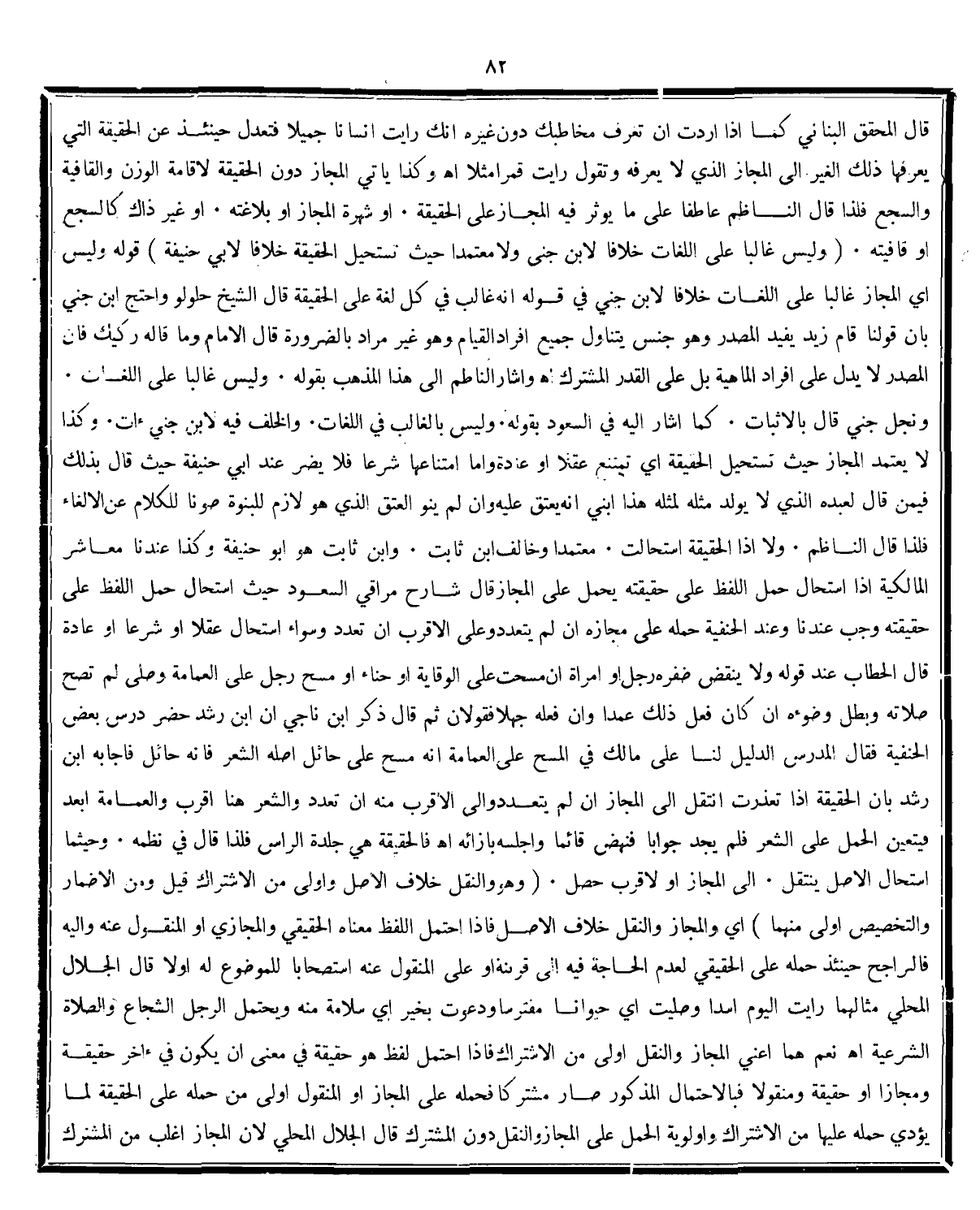 (وَلَيْسَ الْمَجَازُ غَالِبًا عَلَى اللُّغَاتِ خِلَافًا لِابْنِ جِنِّي وَلَا مُعْتَمَدًا حَيْثُ تَسْتَحِيلُ الْحَقِيقَةُ خِلَافًا لِأَبِي حَنِيفَةَ) قوله وليس أي المجاز غالبا على اللغات خلافا لابن جنى في قوله انه غالب فى كل لغة على الحقيقة قال الشيخ حلولو واحتج ابن جنى بان قولنا قام زيد يفيد المصدر وهو جنس يتناول افراد القيام وهو غير مراد بالضرورة قال الامام وما قاله ركيك فان المصدر لايدل على افراد الماهية بل على القدرالمشترك اه. واشار الناظم الى هذالمذهب بقوله: