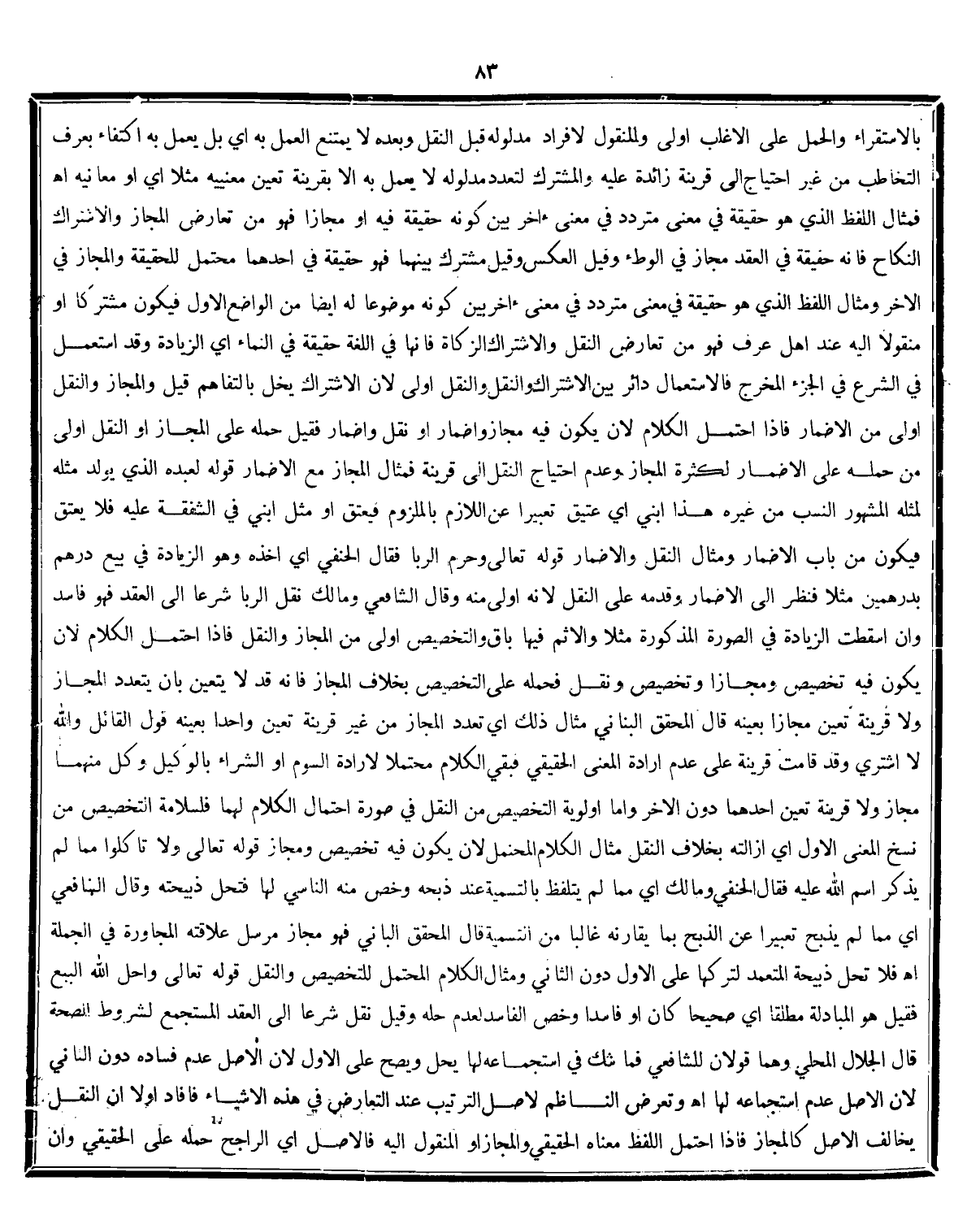 ارادة المعنى الحقيقي فبقى الكلام محتملا لارادة السوم او الشراء بالوكيل وكل منهما مجاز ولا قرينة تعين احدهما دون الاخر واما اولوية التخصيص من النقل فى صورة احتمال الكلام لهما فلسلامة التخصيص من نسخ المعنى الاول أي ازالته بخلاف النقل مثال الكلام المحتمل لايكون فيه تخصيص ومجاز قوله: {وَلَا تَأْكُلُوا مِمَّا لَمْ يُذْكَرْ اسْمُ اللَّهِ عَلَيْهِ} . فقال الحنفى ومالك أي مما لم يتلفظ بالتسمية عند ذبحه وخص منه الناسى لها فتحل ذبيحته وقال البنافعى مِمَّا لَمْ يُذْبَحْ تَعْبِيرًا عَنْ الذَّبْحِ بِمَا يُقَارِنُهُ غَالِبًا مِنْ التَّسْمِيَةِ