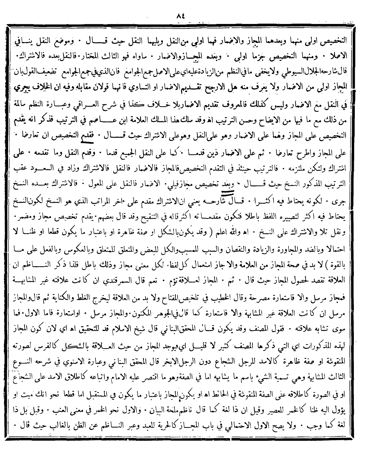 قال شارحه يعنى ان الاشتراك مقدم على ءاخر المراتب الذي هو النسخ لكون النسخ يحتاط فيه اكثر لتصييره اللفظ باطلا فتكون مقدماته اكثر قاله فى التنقيح وقد قال بعضهم