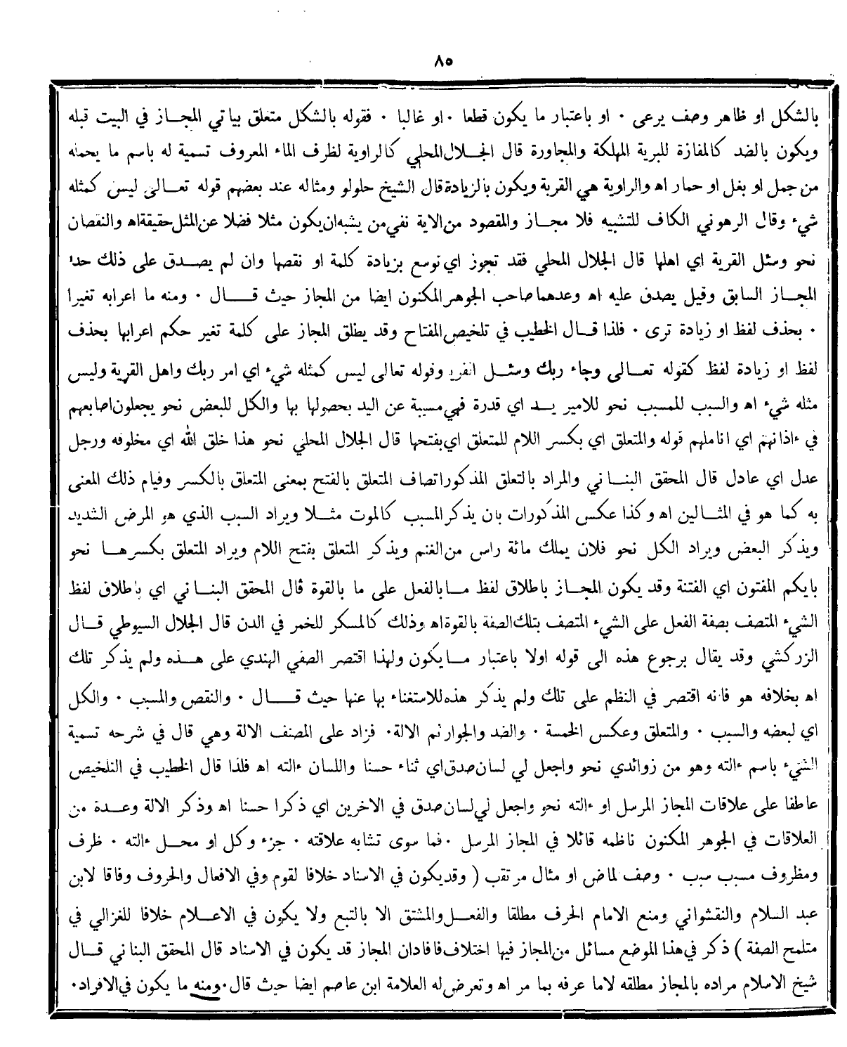 (وَقَدْ يَكُونُ فِي الْإِسْنَادِ خِلَافًا لِقَوْمٍ وَفِي الْأَفْعَالِ وَالْحُرُوفِ وِفَاقًا لِابْنِ عَبْدِ السَّلَامِ والنقشواني وَمَنَعَ الْإِمَامُ الْحَرْفَ مُطْلَقًا وَالْفِعْلَ وَالْمُشْتَقَّ إلَّا بِالتَّبَعِ وَلَا يَكُونُ فِي الْأَعْلَامِ خِلَافًا لِلْغَزَالِيِّ فِي مُتَلَمَّحِ الصِّفَةِ) ذكر فى هذ الموضع مسائل من المجاز فيها اختلاف فافاد ان المجاز قديكو فى الاسناد قال المحقق البنانى قال شيخ الاسلام مراده بالمجاز مطلقه لاماعرفه بما مراه. وتعرض له العلامة ابن عاصم ايضا حيث قال