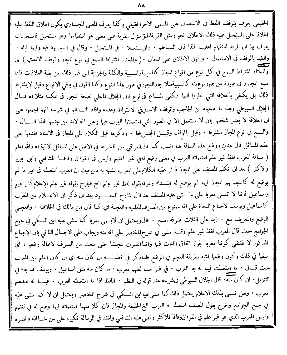 قال الجلال السيوطى وهذا ماصححه ابن الحاجب ووقف الامدي فى الاشتراط وعدمه وافاد الناظم فى شرحه انهم اجمعوا على ان العلاقة لا يعتبر شخصها بان لا تستعمل الافى الصور التى استعملتها العرب فيها وعلى انه لا بد من جنسها فلذاقال: