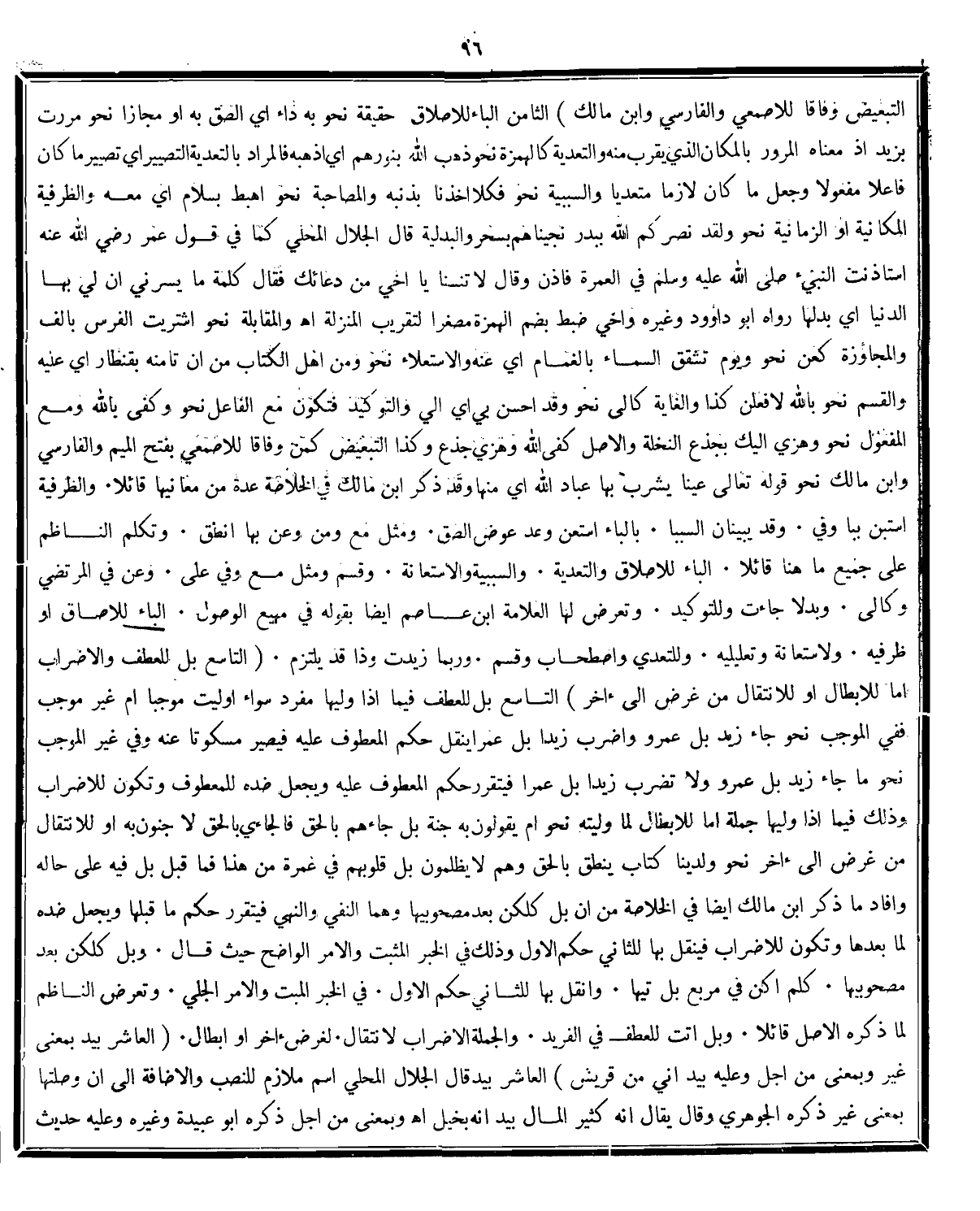 التَّبْعِيضُ وِفَاقًا لِلْأَصْمَعِيِّ وَالْفَارِسِيِّ وَابْنِ مَالِكٍ) الثَّامِنُ الْبَاءُ لِلْإِلْصَاقِ حَقِيقَةً نَحْوُ بِهِ دَاءٌ أَيْ أُلْصِقَ بِهِ وَمَجَازًا نَحْوُ مَرَرْت بِزَيْدٍ اذ معناه المرور بالمكان الذي يقرب منه وَالتَّعَدِّيَةِ كَالْهَمْزَةِ نَحْوُ {ذَهَبَ اللَّهُ بِنُورِهِمْ} أَيْ أَذْهَبَهُ فالمراد بالتعدية التصيير أي تصيير ما كان فاعلا مفعولا وجعل ما كان لازما متعديا وَالسَّبَبِيَّةِ نَحْوُ {فَكُلًّا أَخَذْنَا بِذَنْبِهِ}