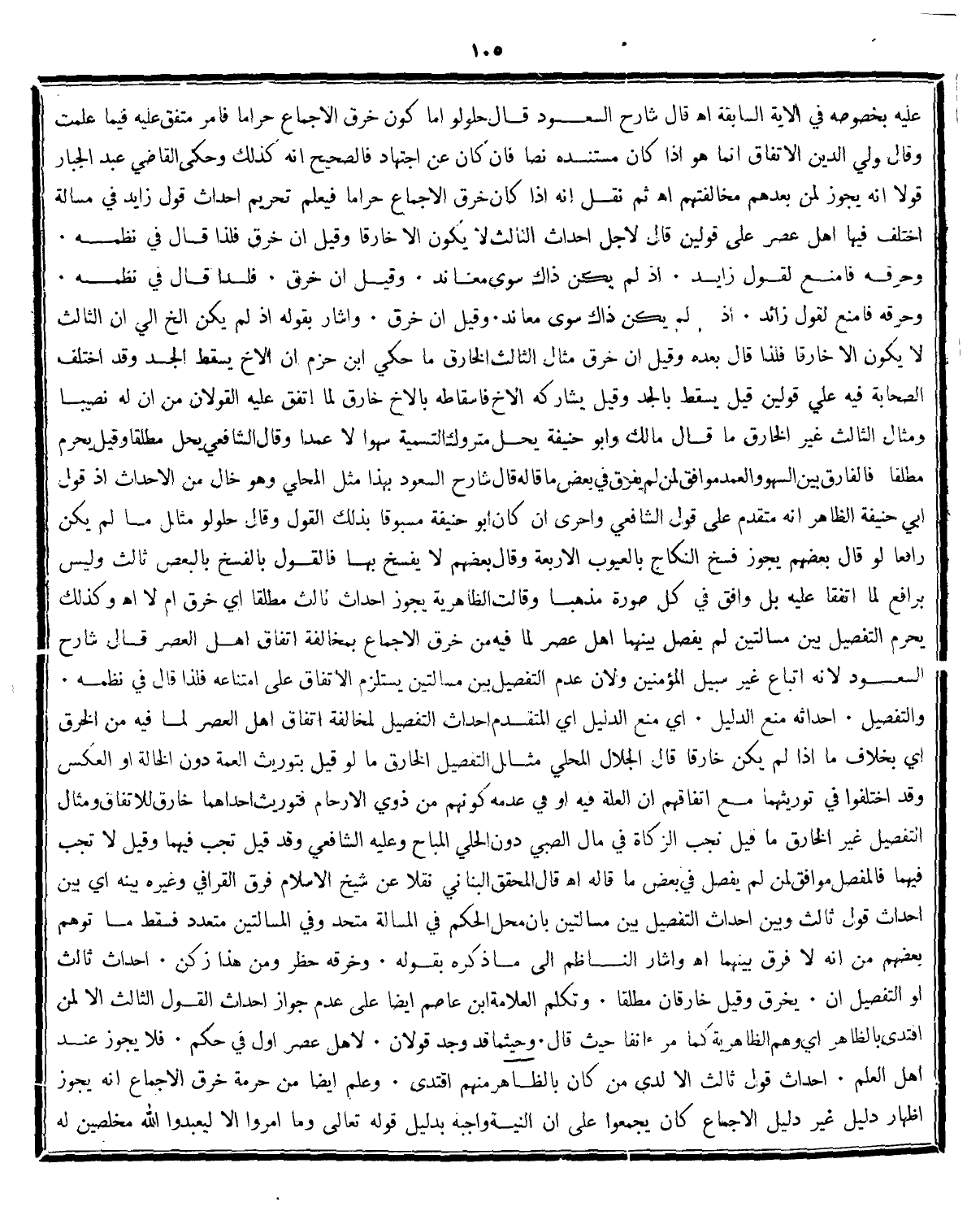 مسبوقا بذلك القول وقال حلولو مثال مالم يكن رافعا لو قال بعضهم يجوز فسخ النكاح بالعيوب الاربعة وقال بعضهم لا يفسخ بها فالقول بالفسخ بالبعض ثالث وليس برافع لما اتفقا عليه بل وافق في كل صورة مذهبا وقالت الظاهرية يجوز احداث ثالث مطلقا أي خرق ام لا اهـ وكذلك يحرم التفصيل بين مسالتين لم يفصل بينهما اهل عصر لما فيه من خرق الاجماع بمخالفة اتفاق اهل العصر قال شارح السعود لانه اتباع غير سبيل المؤمنين ولان عدم التفصيل بين مسالتين يستلزم الاتفاق على امتناعه فلذا قال في نظمه والتفصيل احداثه منع الدليل أي منع الدليل أي المتقدم احداث التفصيل لمخالفة اتفاق اهل العصر لما فيه من الخرق أي بخلاف ما اذا لم يكن خارقا قال الجلال المحلي مثال التفصيل الخارق ما لو قيل بتوريث العمة دون الخالة او العكس وقد اختلفوا في توريثهما مع اتفاقهم ان العلة فيه او في عدمه كونهم من ذوي الارحام فتوريث احداهما خارق للاتفاق ومثال التفصيل غير الخارق ما قيل نجب الزكاة في مال الصبي دون الحلي المباح وعليه الشافعي وقد قيل تجب فيهما وقيل لا تجب فيهما فالمفصل موافق لمن لم يفصل في بعض ما قاله اهـ قال المحقق البناني نقلا عن شيخ الاسلام فرق القرافي وغيره بينه أي بين احداث قول ثالث وبين احداث التفصيل بين مسالتين بان محل الحكم في المسالة متحد وفي المسالتين متعدد فسقط ما توهم بعضهم من انه لا فرق بينهما اهـ واشار الناظم الى ما ذكره بقوله وخرقه حظر ومن هذا ركن احداث ثالث لو التفصيل ان يخرق وقيل خارقان مطلقا وتكلم العلامة ابن عاصم ايضا على عدم جواز احداث القول الثالث الا لمن افتدى بالظاهر أي وهم الظاهرية كما مر ءانفا حيث قال وحيثما قد وجد قولان لاهل عصر اول في حكم فلا يجوز عند اهل العلم احداث قول ثالث الا لدى من كان بالظاهر منهم اقتدى وعلم ايضا من حرمة خرق الاجماع انه يجوز اظهار دليل غير دليل الاجماع كان يجمعوا على ان النية واجبة