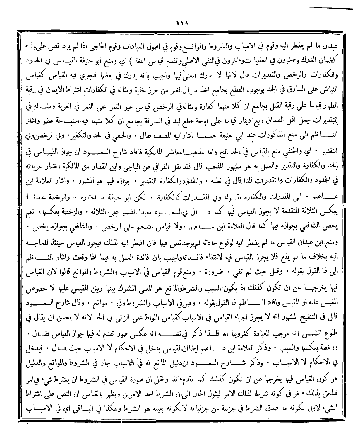 عبدان ما لم يضطر اليه وقوم في الاسباب والشروط والموانع وقوم في اصول العبادات وقوم الحاجي اذا لم يرد نص على وقته كضمان الدرك وءاخرون في العقليات وءاخرون في النفي الاصلي وتقدم قياس اللغة أي ومنع ابو حنيفة القياس في الحدود والكفارات والرخص والتقديرات قال لانها لا يدرك المعنى فيها واجيب بانه يدرك في بعضها فيجري فيه الياس كقياس النباش على السارق في الحد بوجوب القطع بجامع اخذ مال الغيرمن حرز خفية ومثاله في الكفارات اشتراط الايمان في رقبة الظهار قياسا على رقبة القتل بجامع ان كلا منهما كفارة ومثاله في الرخص قياس غير التمر على التمر في العرية ومثاله في التقديرات جعل اقل الصداق ربع دينار قياسا على اباحة قطع اليد في السرقة بجامع ان كلا منهما فيه استباحة عضو واشار الناظم الى منع المذكورات عند ابي حنيفة حسبما اشار اليه المصنف فقال والحنفي في الحد والتفكير وفي ترخص وفي التقدير أي والحنفي منع القياس في الحد الخ واما مذهبنا معاشر المالكية فافاد شارح السعود ان جواز القياس في الحد والكفارة والتقدير والعمل به هو مشهور المذهب قال فقد نقل القرافي عن الباجي وابن القصار من المالكية اختيار جريانه في الحدود والكفارات والتقديرات فلذا قال في نظمه والحدود والكفارة التقدير جوازه فيها هو المشهور واشار العلامة ابن عاصم الى المقدرات والكفارة بقوله وفي المقدرات كالكفارة لكن ابو حنيفة ما اختاره