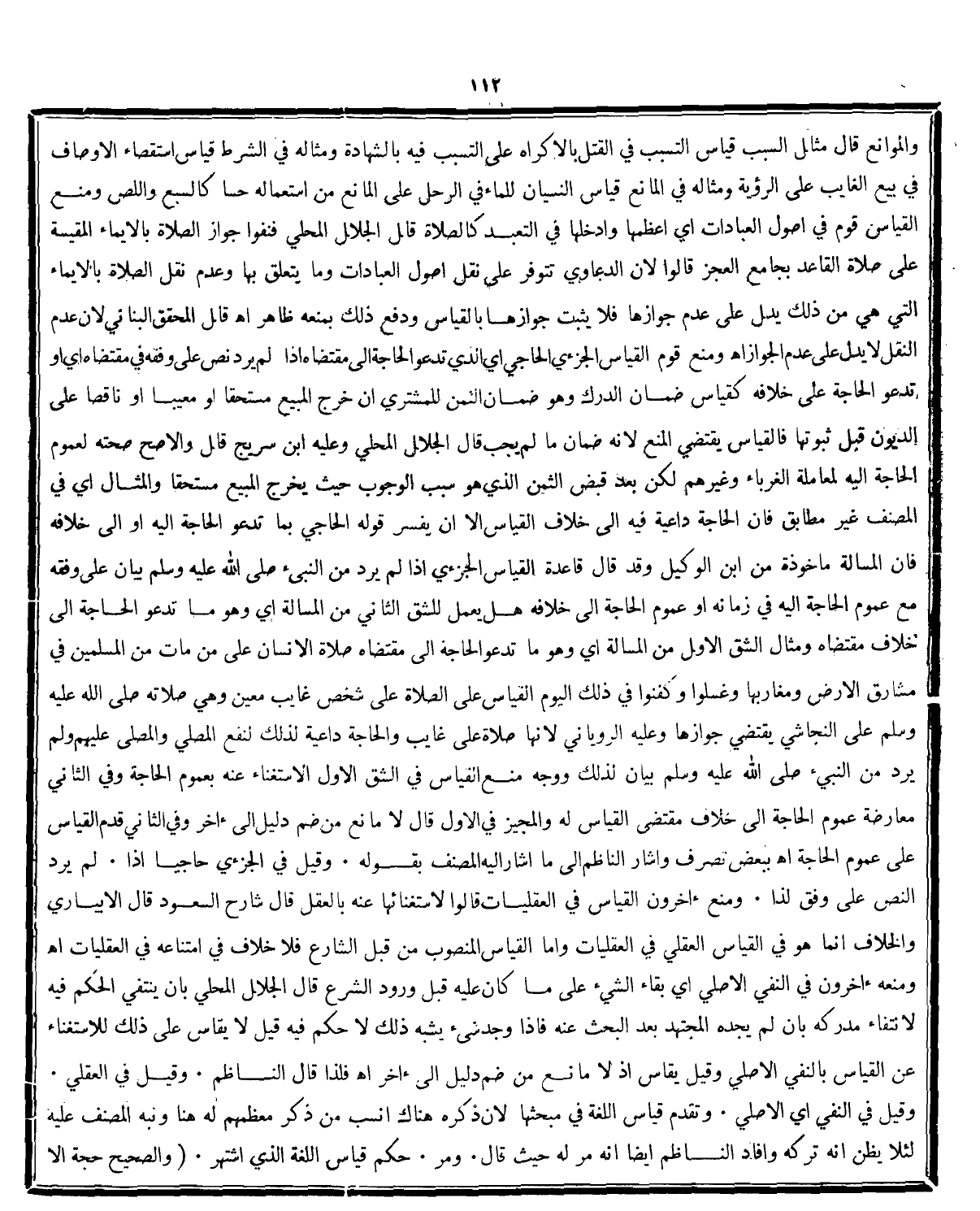 الغايب على الرؤية ومثاله في المانع قياس النسيان للماء في الرحل على المانع من استعماله حسا كالسبع واللص ومنع القياس قوم في اصول العبادات أي اعظمها وادخلها في التعبد كالصلاة قال الجلال المحلي فنفوا جواز الصلاة بالايماء المقيسة على صلاة القاعد بجامع العجز قالوا لان الدعاوي تتوفر على نقل اصول العبادات وما يتعلق بها وعدم نقل الصلاة بالايماء التي هي من ذلك يدل على عدم جوازها فلا يثبت جوازها فلا يثبت بالقياس ودفع ذلك بمنعه ظاهر اهـ قال المحقق البناني لان عدم النقل لا يدل على عدم الجواز اهـ ومنع قوم القياس الجزءي الحاجي أي الذي تدعو الحاجة الى مقتضاه اذا لم يرد نص على وقفه في مقتضاه أي او تدعو الحاجة على خلافه كقياس ضمان الدرك وهو ضمان الثمن للمشتري ان خرج المبيع مستحقا او معيبا او ناقصا على الديون قبل ثبوتها فالقياس يقتضي المنع لانه ضمان مالم يجب قال الجلال المحلي وعليه ابن سريج قال والاصح صحته لعموم الحاجة اليه لمعاملة الغرباء وغيرهم لكن بعد قبض الثمن الذي هو سبب الوجوب حيث يخرج المبيع مستحقا والمثال أي في المصنف غير مطابق فان الحاجة داعية فيه الى خلاف القياس الا ان يفسر قوله الحاجي بما تدعوالحاجة اليه او الى خلافه فان المسالة ماخوذة من ابن الوكيل وقد قال قاعدة القياس الجزءي اذا لم يرد من النبئ صلى الله عليه وسلم بيان على وفقه مع عموم الحاجة اليه في زمانه او عموم الحاجة الى خلافه هل يعمل للشق الثاني من المسالة أي وهو ما تدعو لحاجة الى خلاف مقتضاه ومثال الشق الاول من المسالة أي وهو ما تدعو الحاجة الى مقتضاه صلاة الانسان على من مات من المسلمين في مشارق الارض ومغاربها وغسلوا وكفنوا في ذلك اليوم القياس على الصلاة على شخص غايب معين وهي صلاته صلى الله عليه وسلم على النجاشي يقتضي جوازها وعليه الروياني لانها صلاة على غايب والحاجة داعية لذلك لنفع المصلي والمصلى عليهم ولم يرد من النبيء