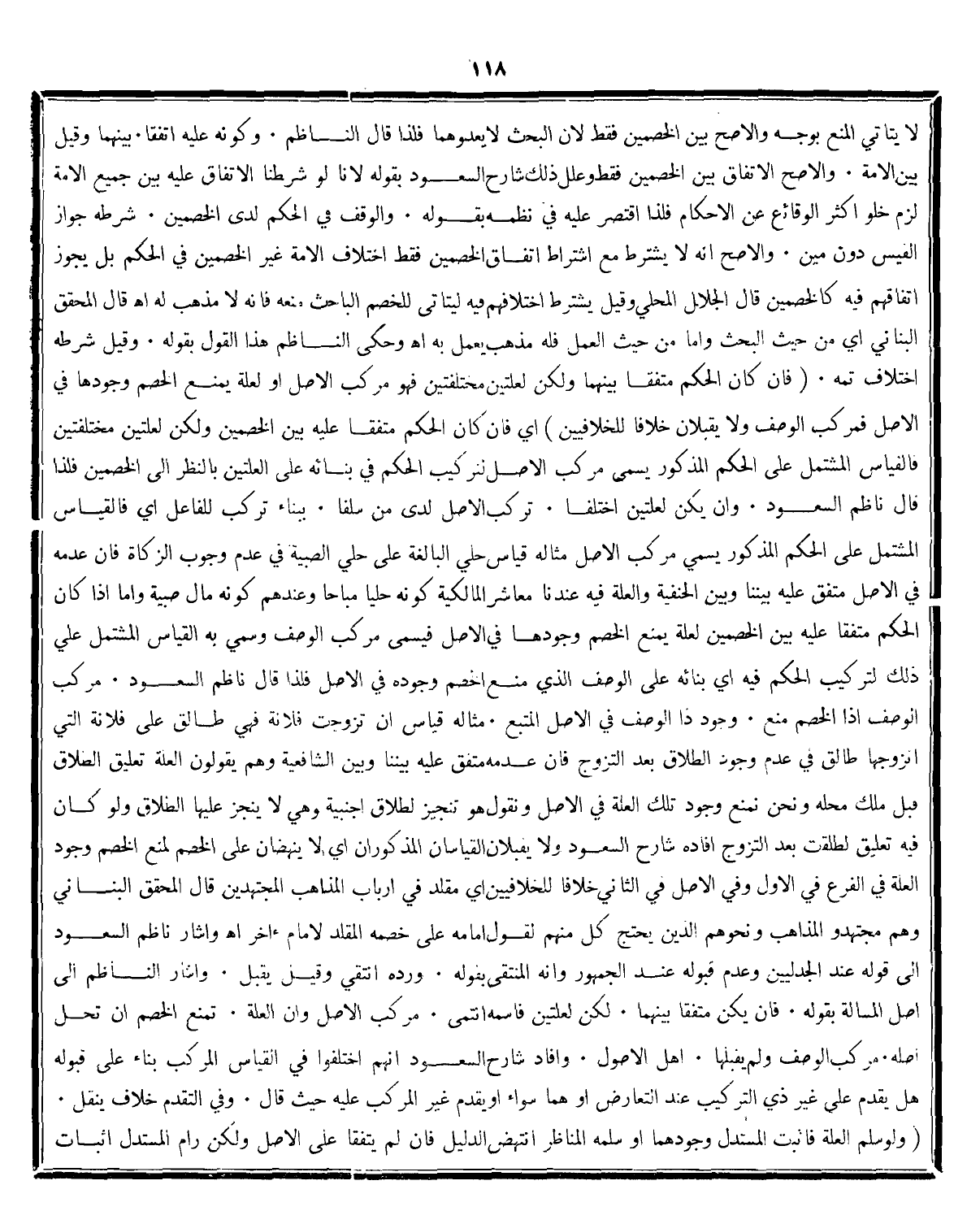 لا يتاتي المنع بوجه والاصح بين الخصمين فقط لان البحث لا يعدوهما فلذا قال الناظم وكونه عليه اتفقا بينهما وقيل بين الامة والاصح الاتفاق بين الخصمين فقط وعلل ذلك شارح السعود بقوله لانا لو شرطنا الاتفاق عليه بين جميع الامة لزم خلو اكثر الوقائع عن الاحكام فلذا اقتصر عليه في نظمه بقوله والوقف في الحكم لدى الخصمين شرطه جواز القيس دون مين والاصح انه لا يشترط مع اشتراط اتفاق الخصمين فقط اختلاف الامة غير الخصمين في الحكم بل يجوز اتفاقهم فيه كالخصمين قال الجلال المحلي وقيل يشترط اختلافهم فيه ليتاتى للخصم الباحث منعه فانه لا مذهب له اهـ قال المحقق البناني أي من حييث البحث واما من حيث العمل فله مذهب يعمل به اهـ وحكى الناظم هذا القول بقوله وقيل شرطه اختلاف تمه فان كان الحكم متفقا بينهما ولكن لعلتين مختلفتين فهو مركب الاصل او لعلة يمنع الخصم وجودها في الاصل فمركب الوصف ولا يقبلان خلافا للخلافيين أي فان كان الحكم متفقا عليه بين الخصمين ولكن لعلتين مختلفين فالقياس المشتمل على الحكم المذكور يسمى مركب الاصل لتركيب الحكم في بنائه على العلتين بالنظر الى الخصمين فلذا قال ناظم السعود وان يكن لعلتين اختلفا تركب الاصل لدى من سلفا ببناء تركب للفاعل أي فالقياس المشتمل على الحكم المذكور يسمي مركب الاصل مثاله قياس حلي البالغة على حلي الصبية في عدم وجوب الزكاة فان عدمه في الاصل متفق عليه بيننا وبين الحنفية والعلة فيه عندنا معاشر المالكية كونه حليا مباحا وعندهم كونه مال صبية واما اذا كان الحكم متفقا عليه بين الخصمين لعلة يمنع الخصم وجودها في الاصل فيسمى مركب الوصف وسمي به القياس المشتمل علي ذلك لتركيب الحكم فيه أي بنائه على الوصف الذي منع الخصم وجوده في الاصل فذا قال ناظم السعود مركب الوصف اذا الخصم منع وجود ذا الوصف في